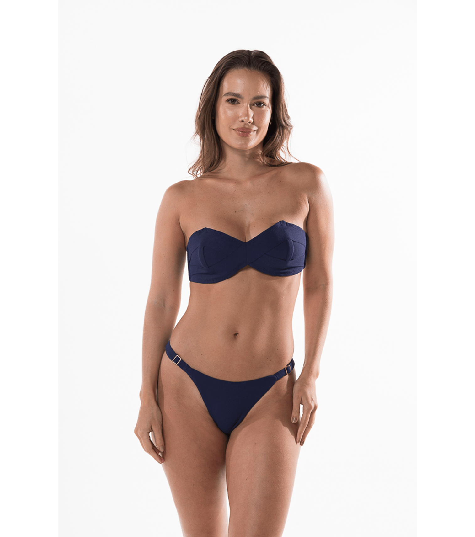 Top tomara que caiarecortes cruzado, cor azul marinho, com abotoadores nas costas
