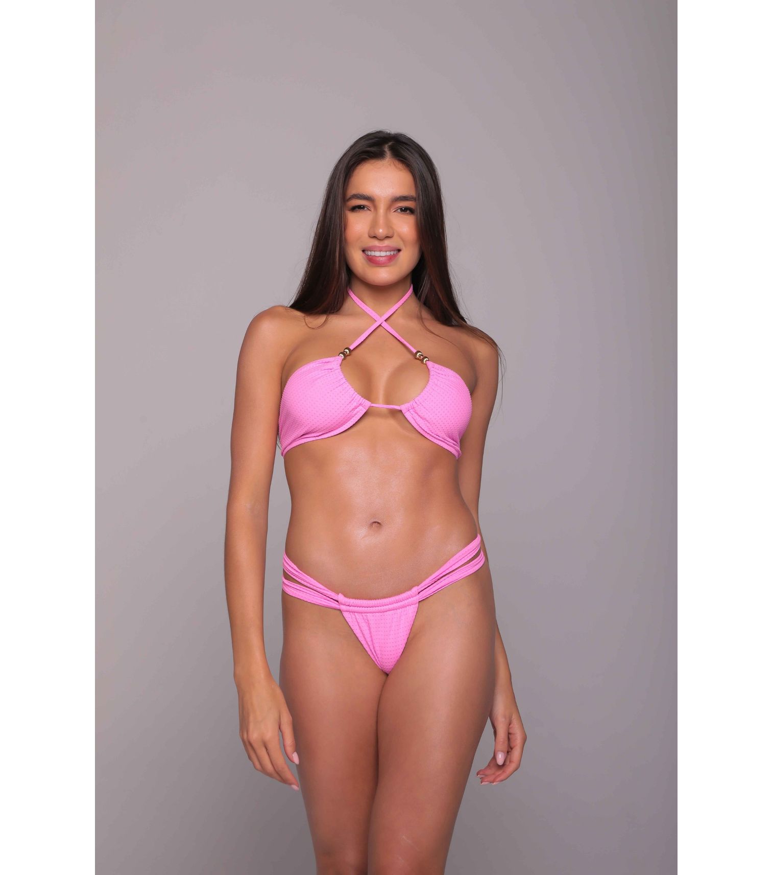 Top de biquíni cortininha invertido, cor bliss textura, com bojo removível, amarração nas costas e metais.