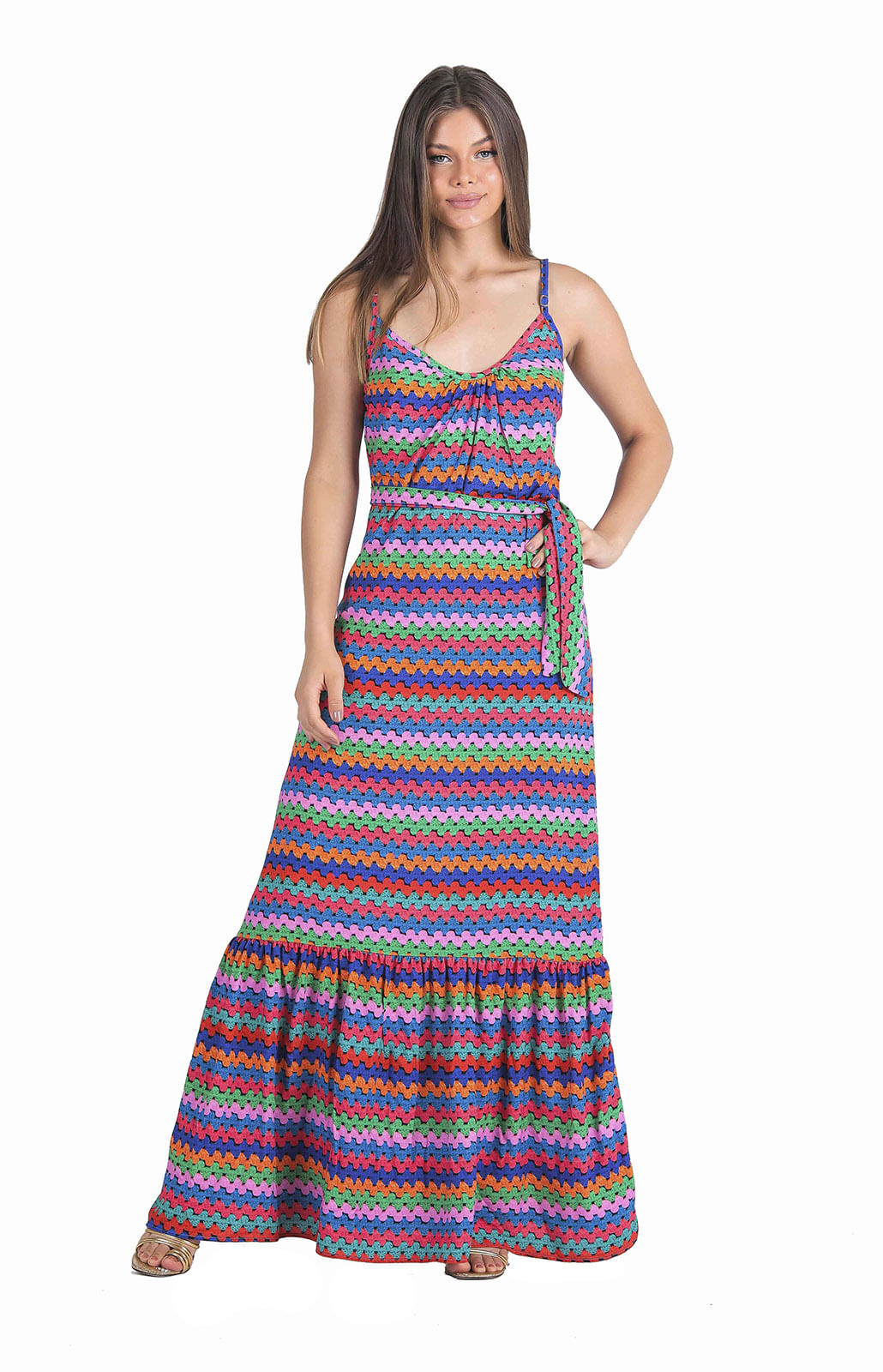 Crochê colorido vestido longo de alcinha e faixa de amarração M