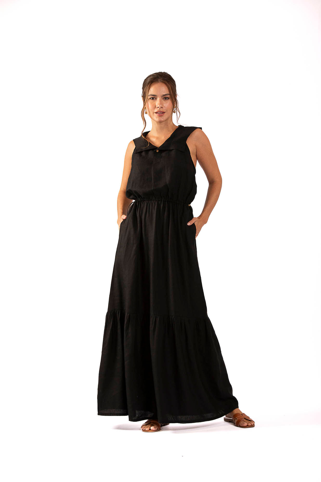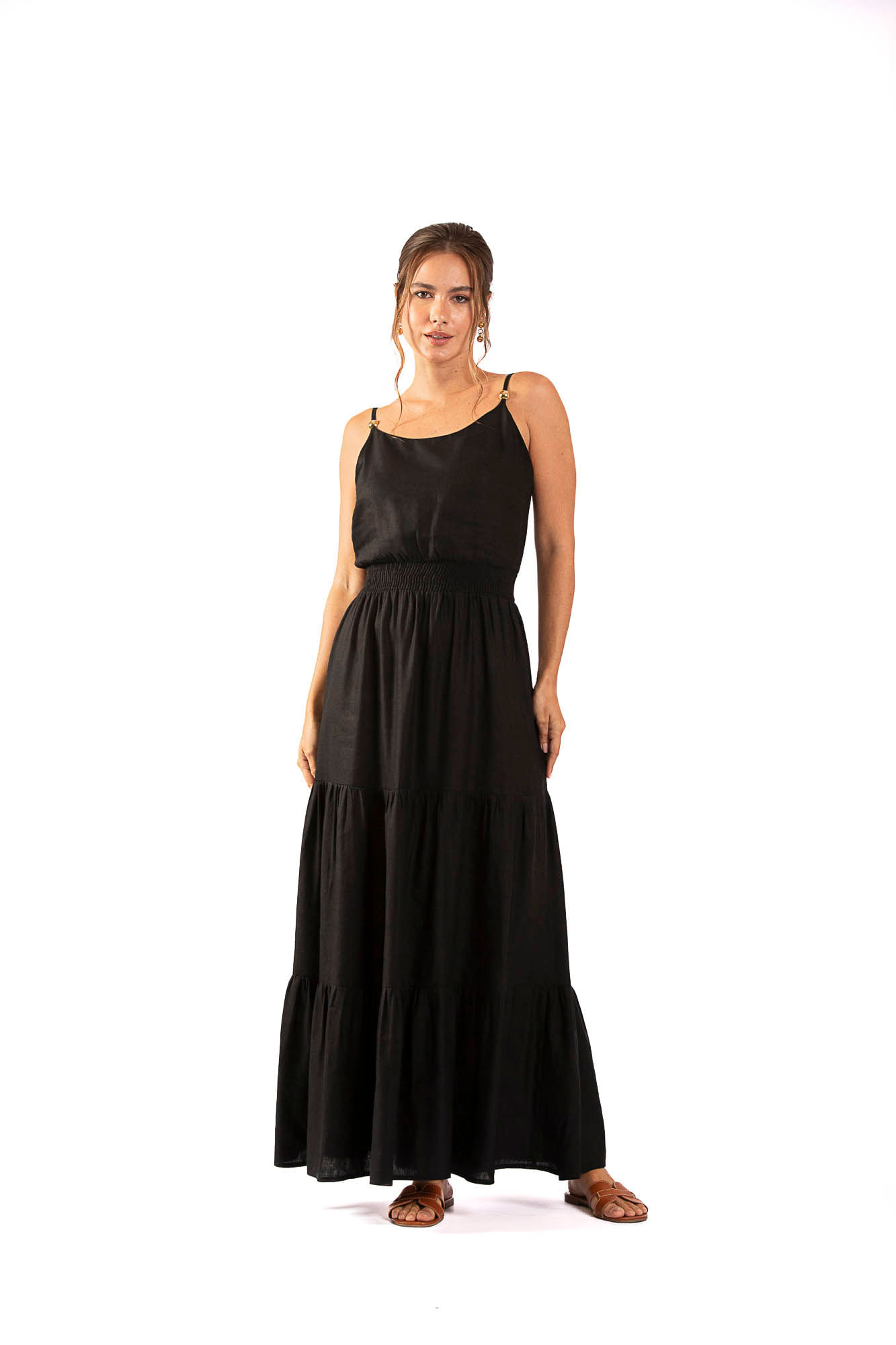 Preto vestido longo franzido M