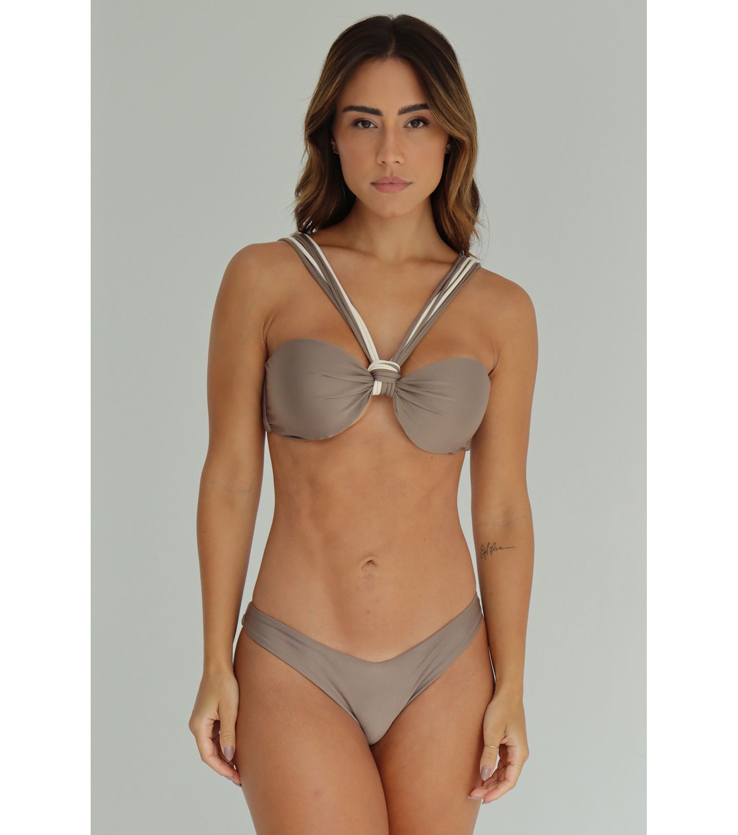 Top de biquíni estruturado com tiras cruzadas bicolor, cor castanho, com bojo fixo e abotoador nas costas tecido 85% poliamida 15% elastano forro 88,6% poliamida 11,4% elastano