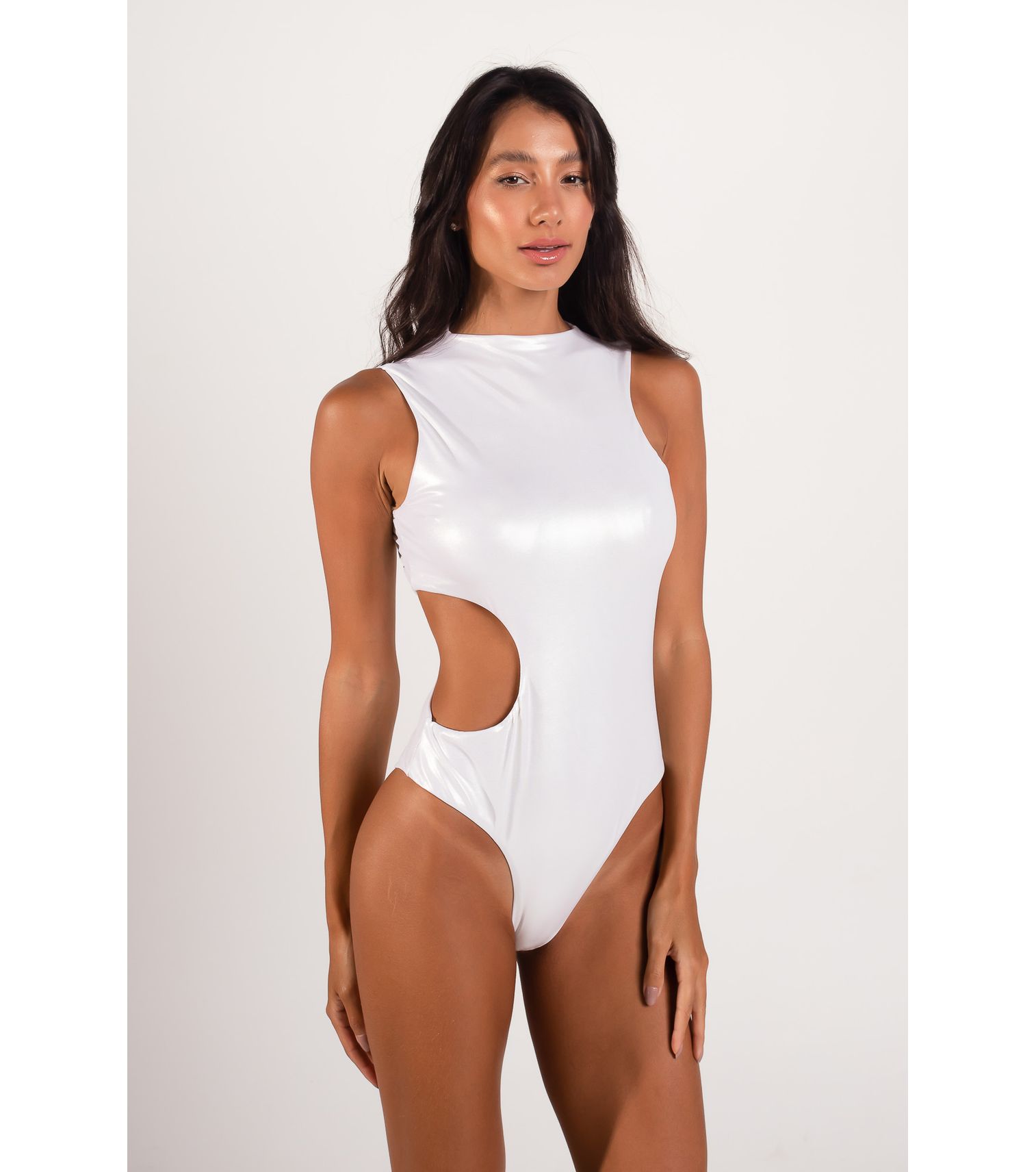 Body curvas, com recorte na cintura, cor champagne metalizado.