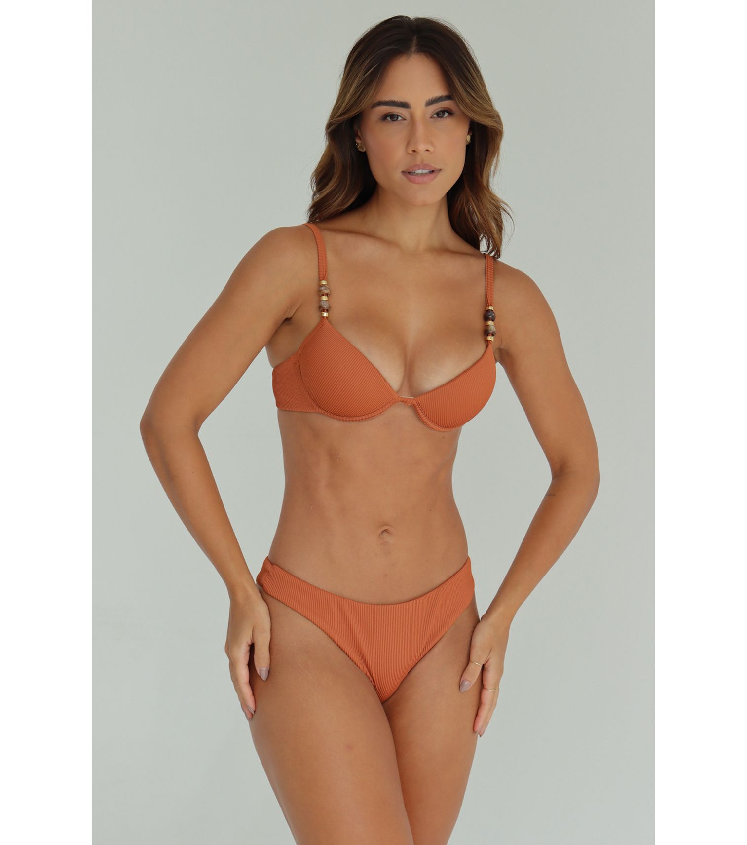 Top de biquíni estruturado meia taça com alças em bolinhas, conhaque, com bojo fixo, alças regulaveis e abotoador nas costas.
