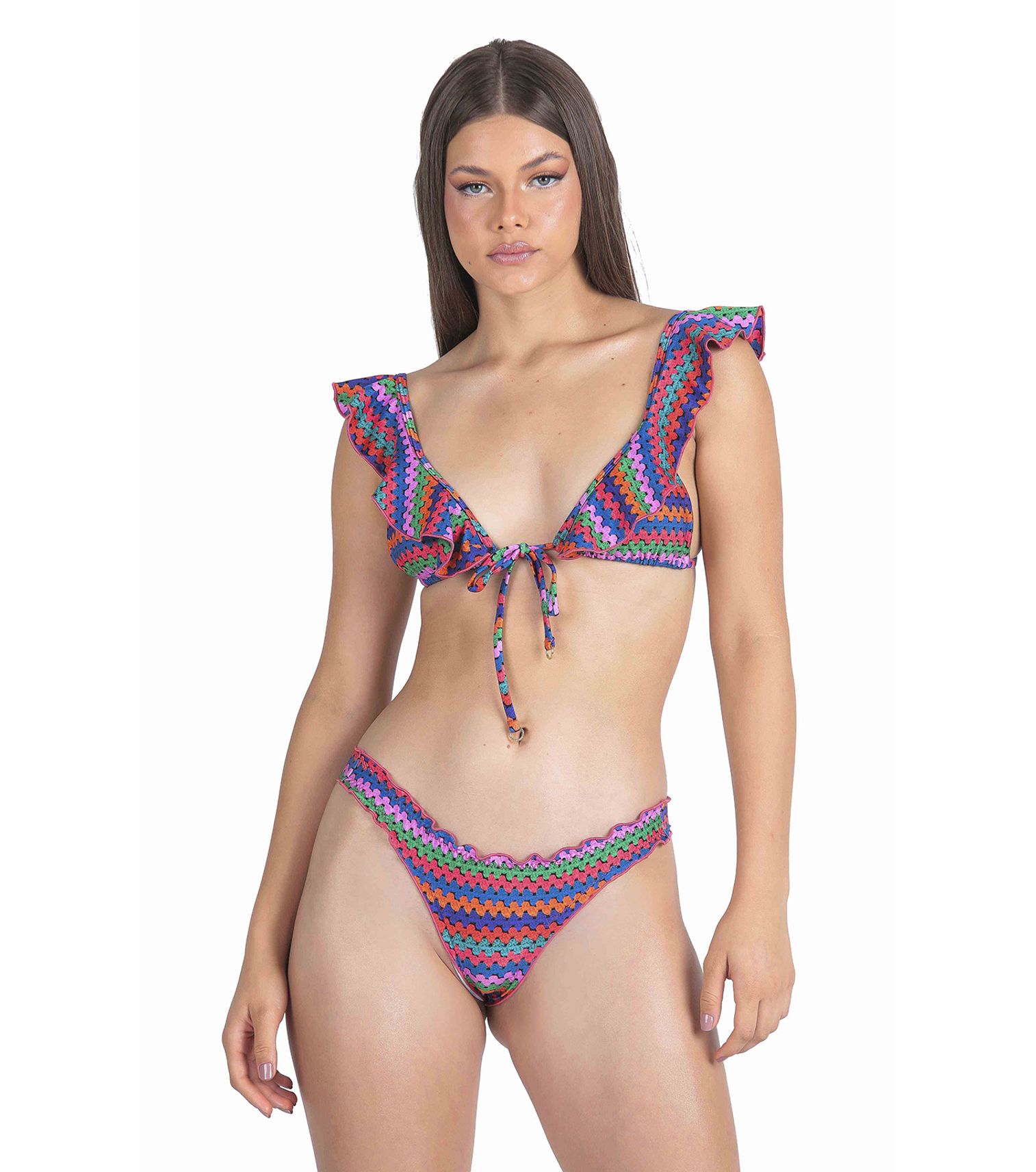 Calcinha de biquíni com picô vermelho e franzido ''levanta bumbum'', estampa crochê colorido.