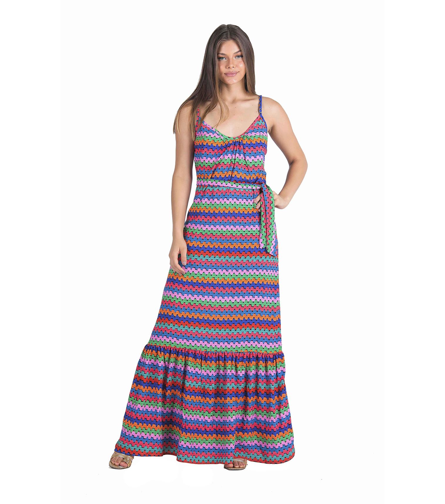 Vestido longo de alcinha e faixa de amarração, estampa crochê colorido