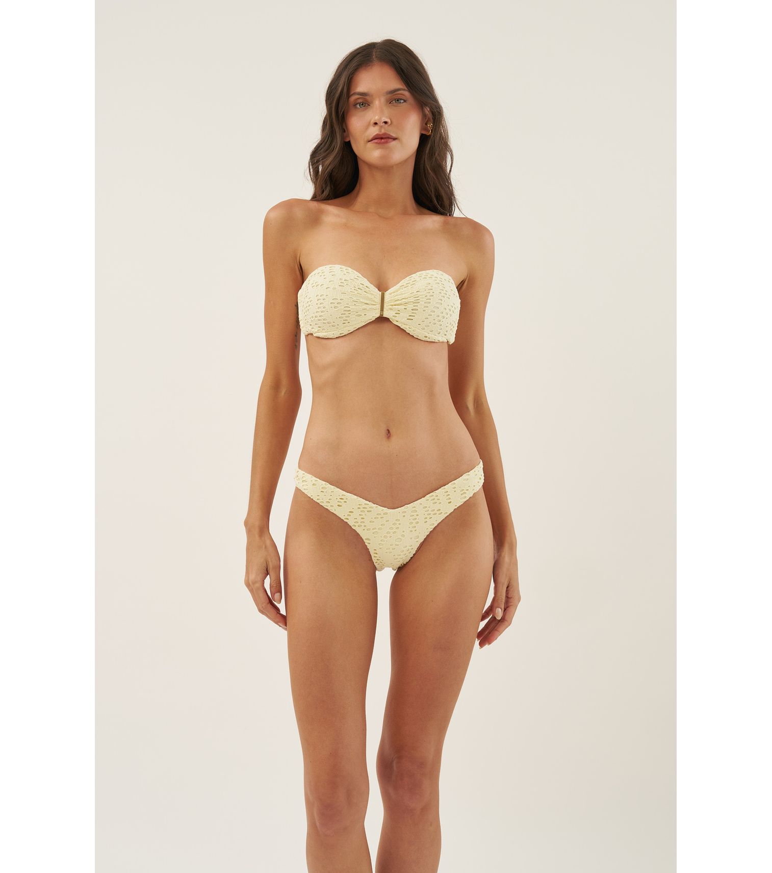Top tomara que caia estruturado, com bojo fixo, alças removíveis e abotoador nas costas, cor crochet manteiga tecido: junco maq 96% poliamida e 4% elastano forro: poliamida e 10% elastano.