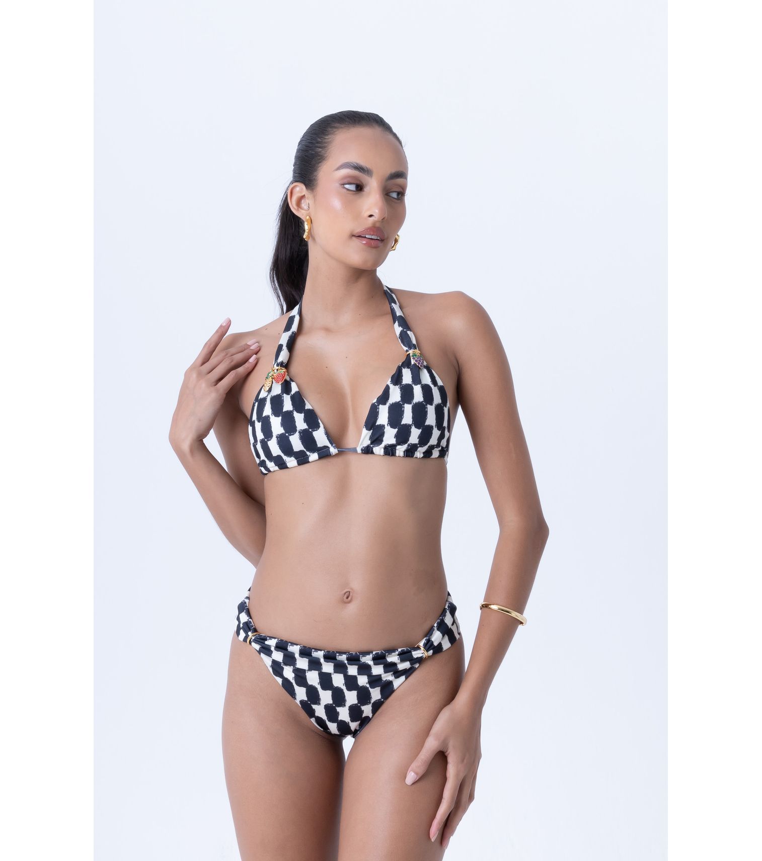 Top de biquini cortinão, estampa damier preto, com bojo removivel, metais e amarração nas costas.