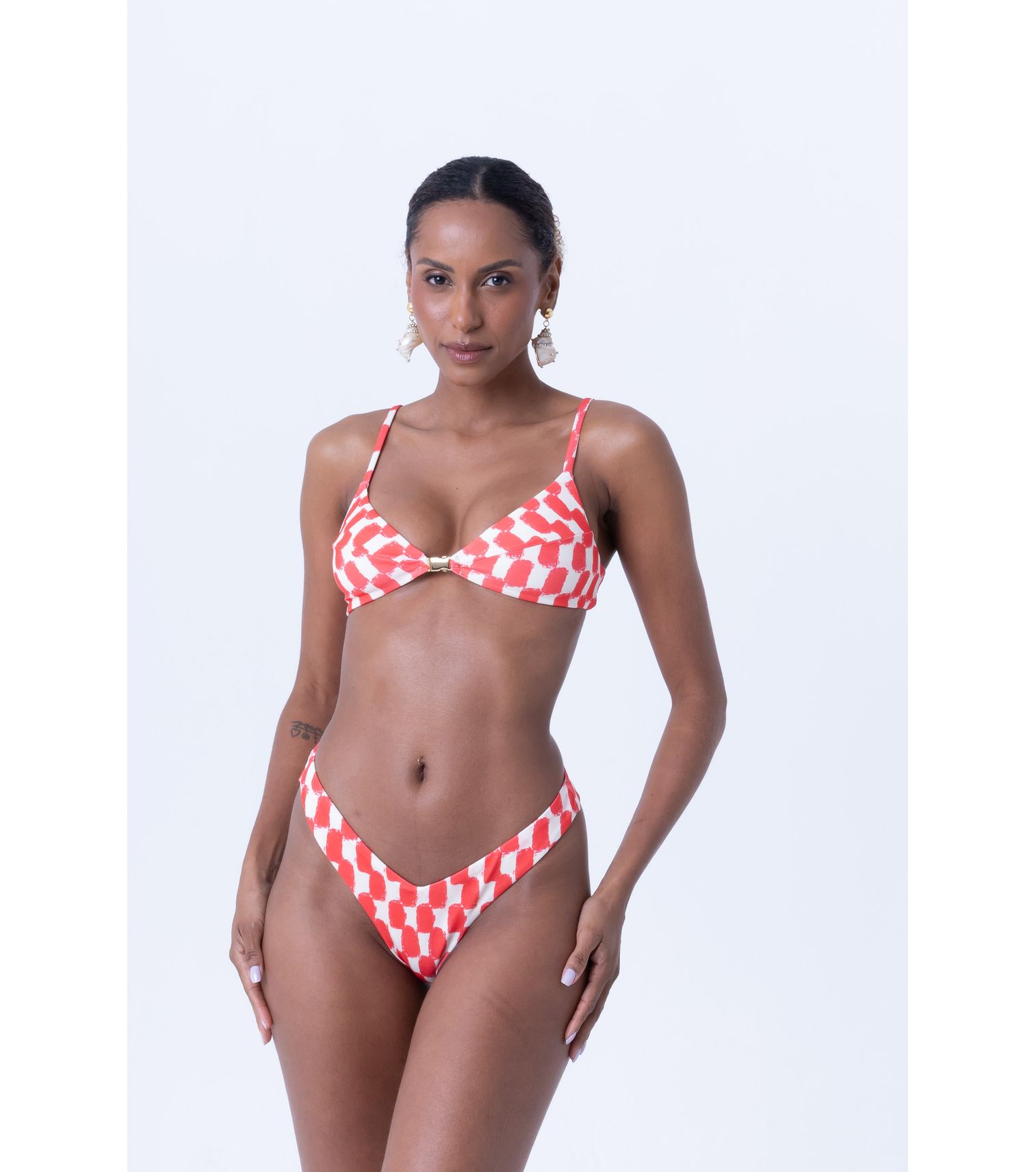 Top triângulo com fivela, estampa damier vermelho, com alças regulaveis e bojo removivel.