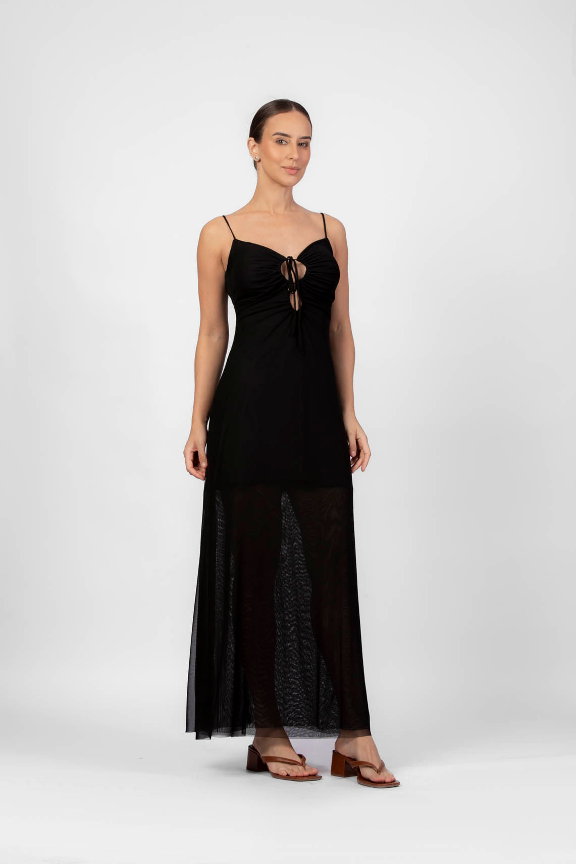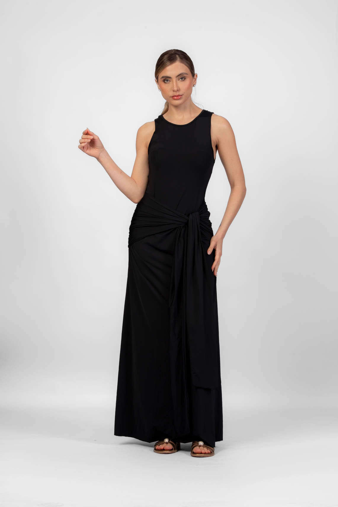 Preto vestido longo franzido com amarração frontal P