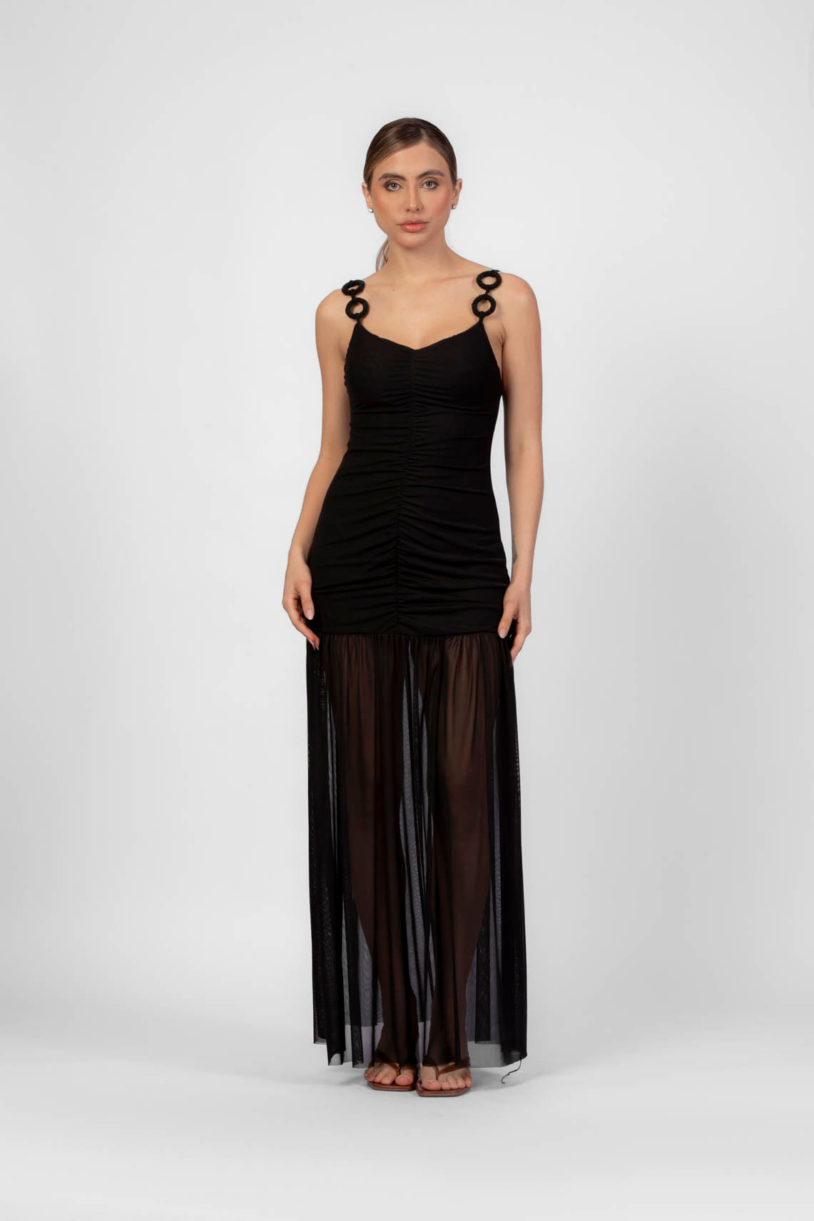 Preto vestido longo tule franzido P