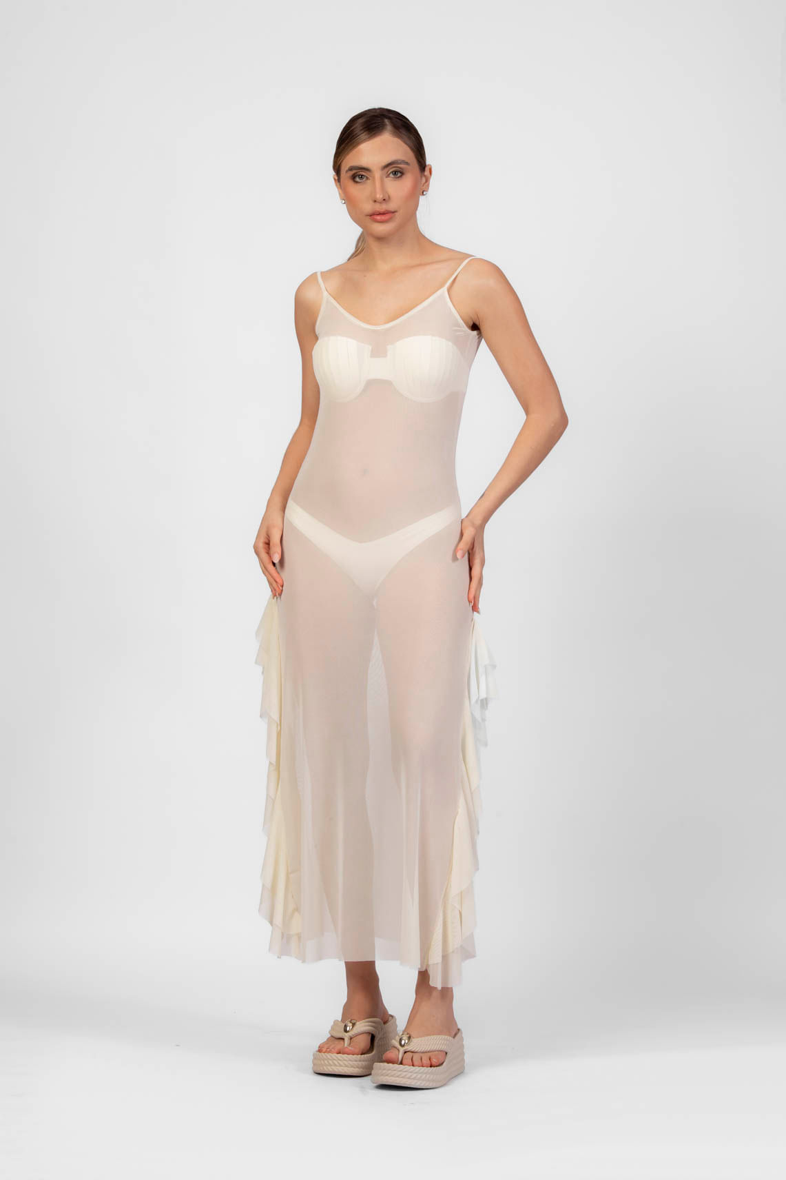 Shell off white vestido tule longo com babados laterais P