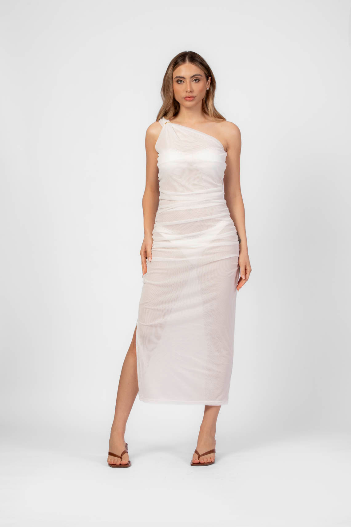 Off white vestido tule franzido um ombro só com argola P