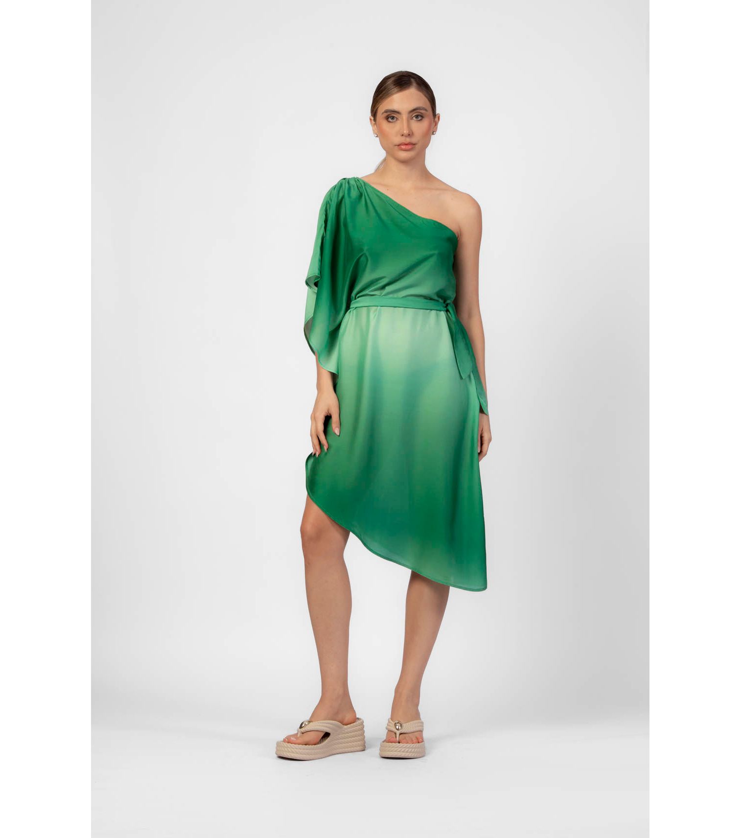 Pistache vestido um ombró só franzido faixa e argola P