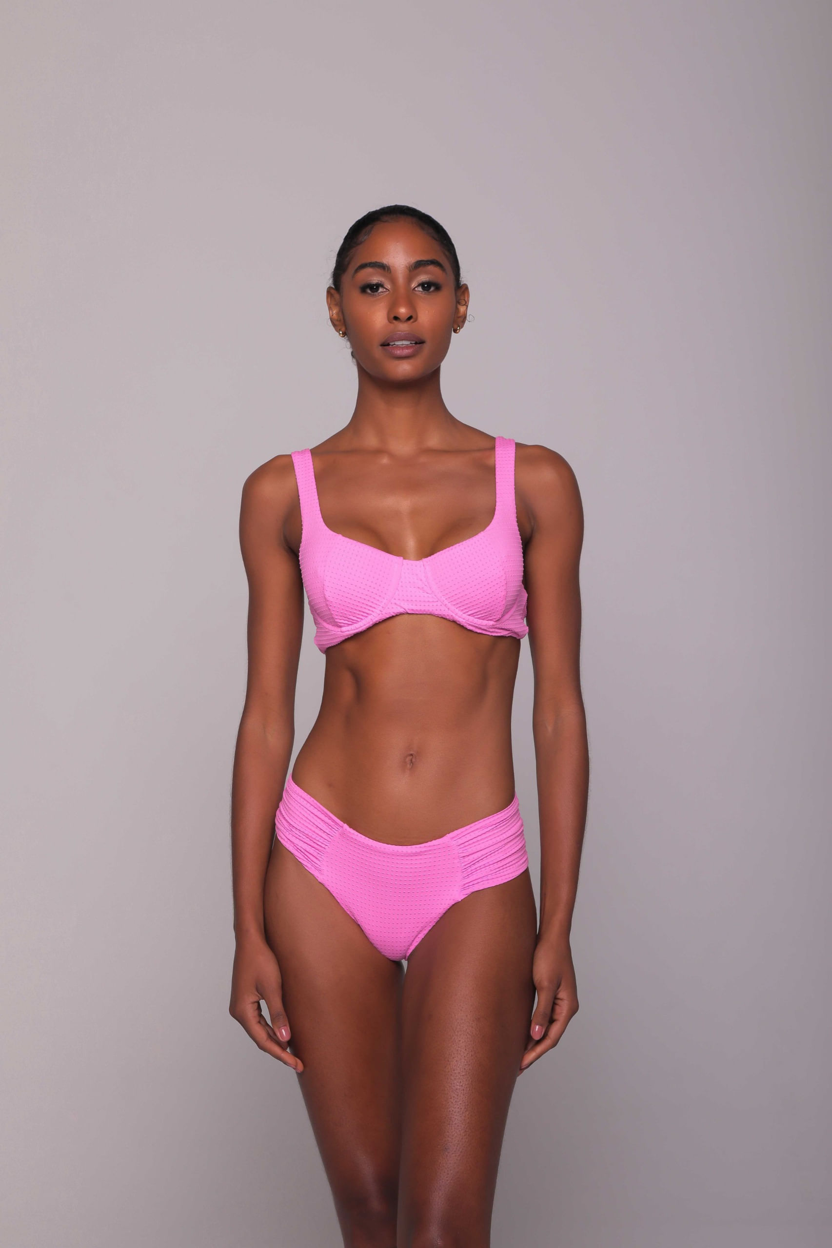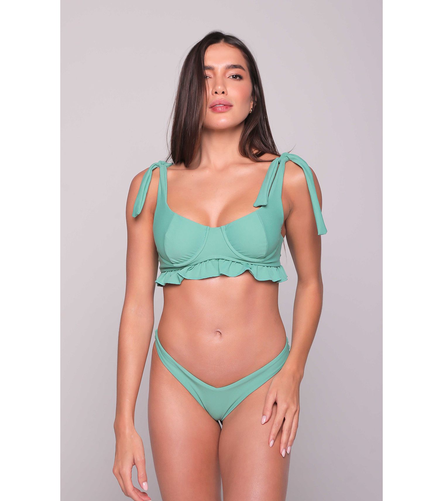 Top de biquíni meia taça com babado cor jade crepon, com bojo removível e amarração no ombro.