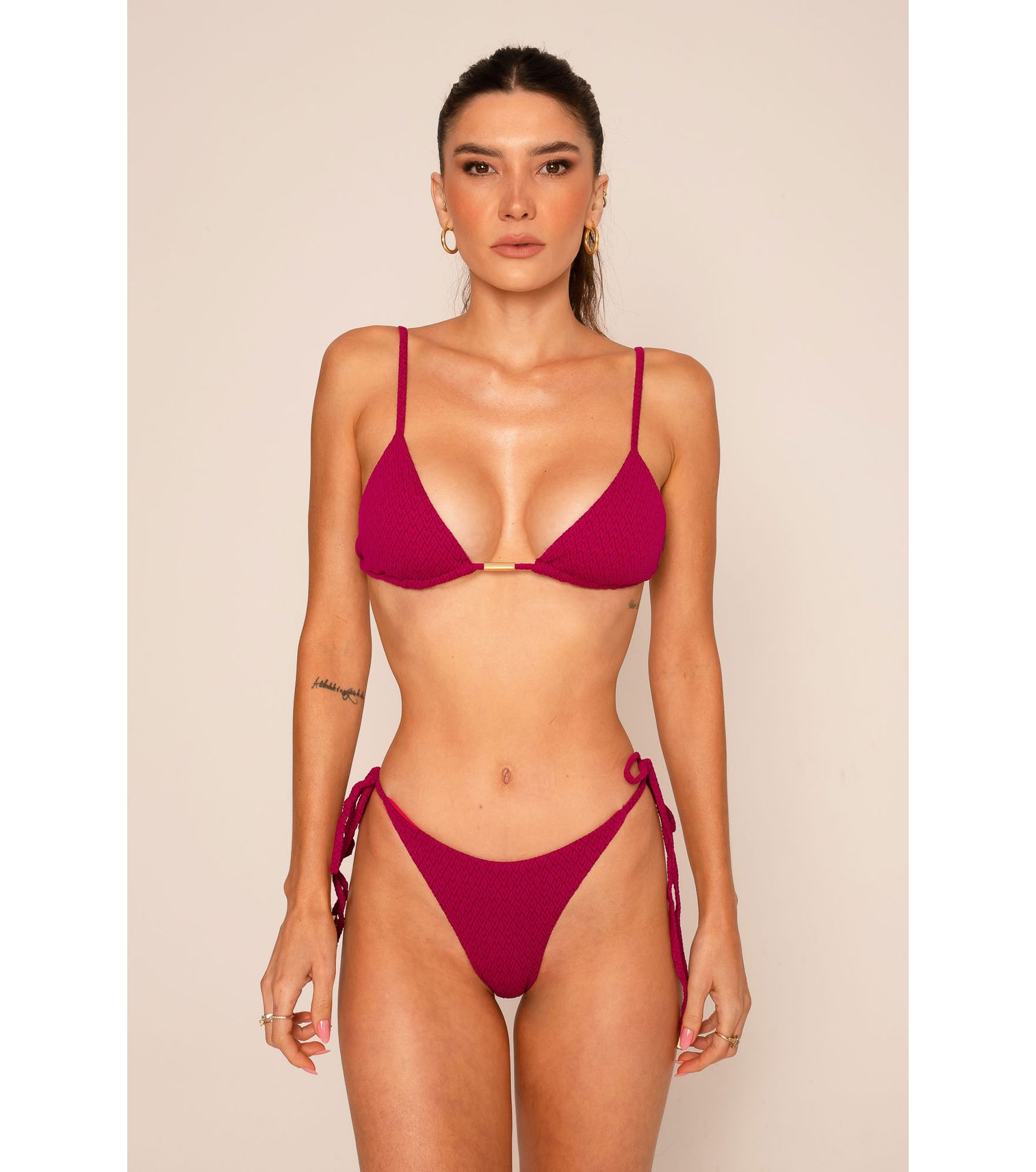 Calcinha de biquíni lacinho dupla com recorte no bumbum, cor magenta texturizado, com metais.