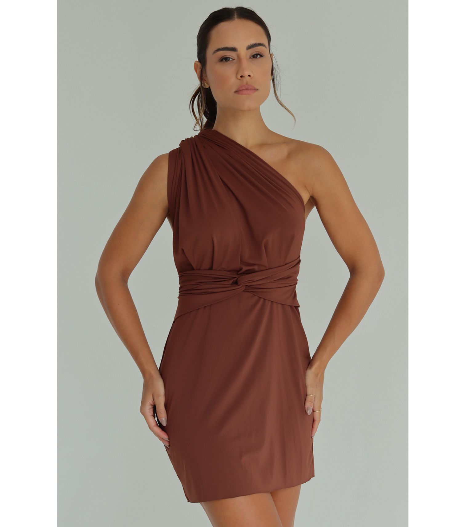 Saída curta um ombro só com nó na cintura cor marrom cacau tecido luna- 85% poliamida 15% elastano medidas da nossa modelo: tamanho- p cintura- 65cm busto- 87cm quadril- 95cm altura- 1,63cm