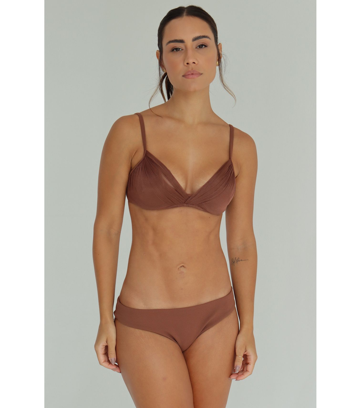 Top de biquíni transpassado com aro, cor marrom cacau com bojo removivel, alças regulaveis e amarração nas costas