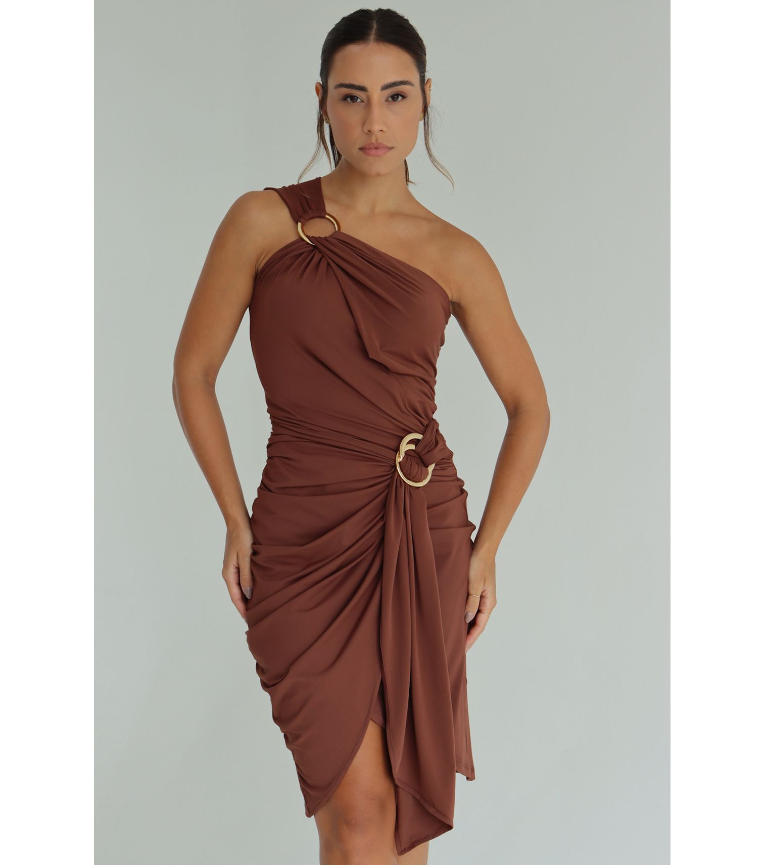 Marrom cacau vestido tule um ombro só franzido lateral P