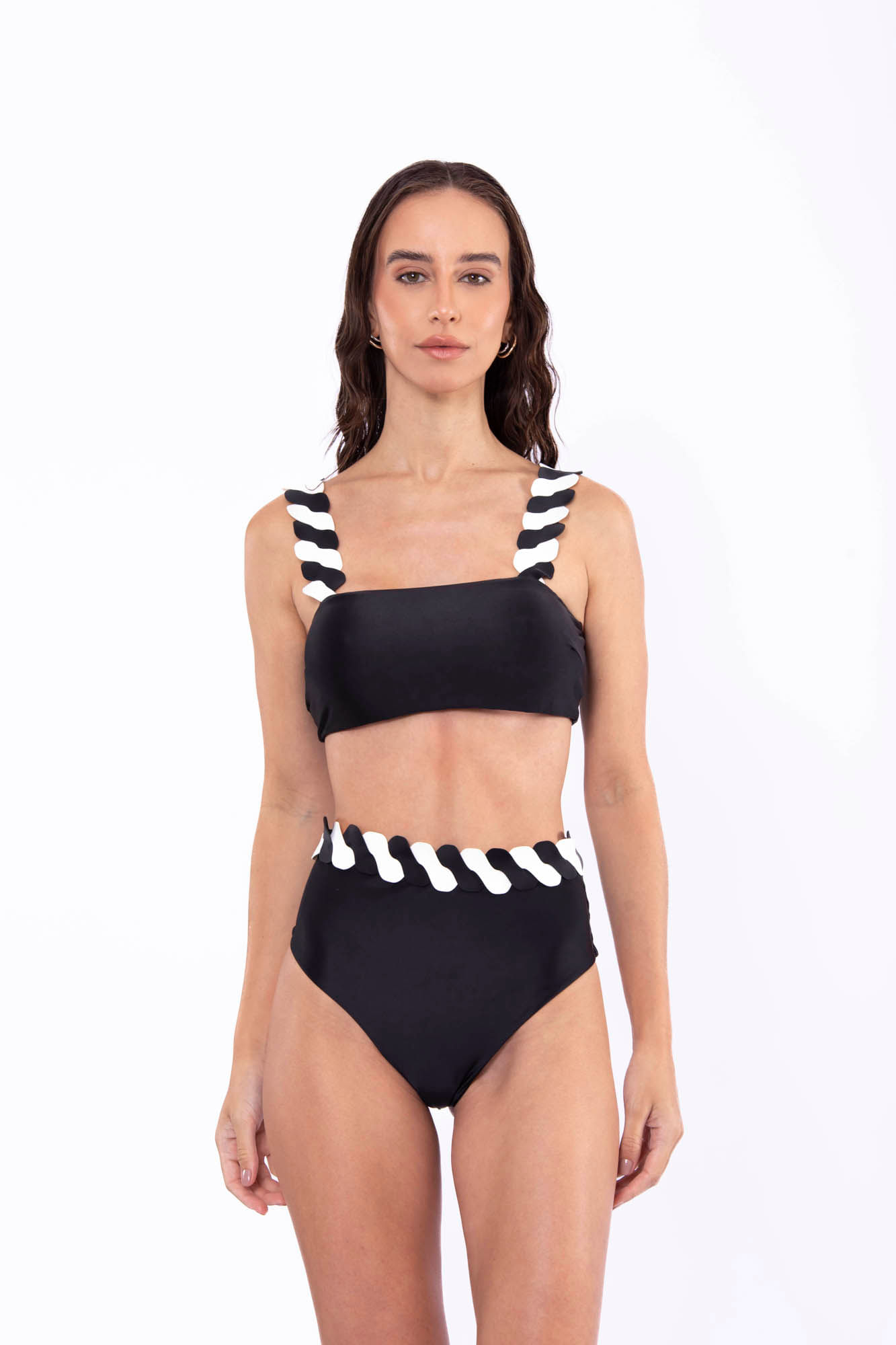 Preto e branco calcinha de biquíni hot pants com cinto em trança P