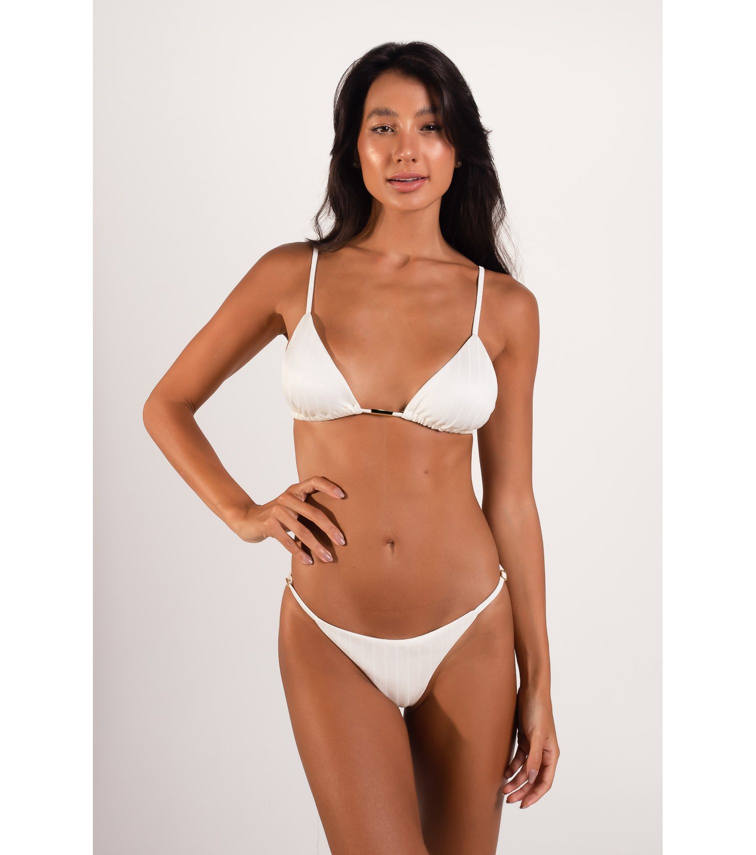 Top de biquíni cortininha duplo com reguladores, cor off white listras, com bojo removível.