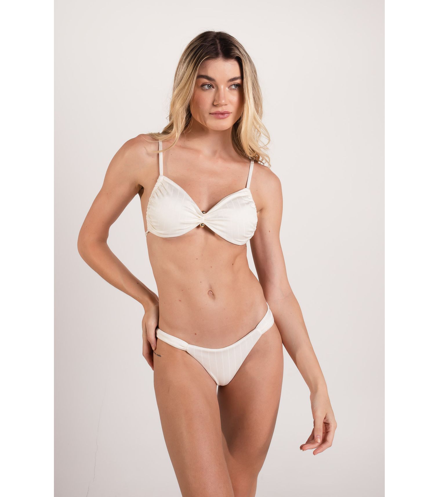 Top de biquíni triângulo, com piercing, na cor off white listras, com bojo removível.