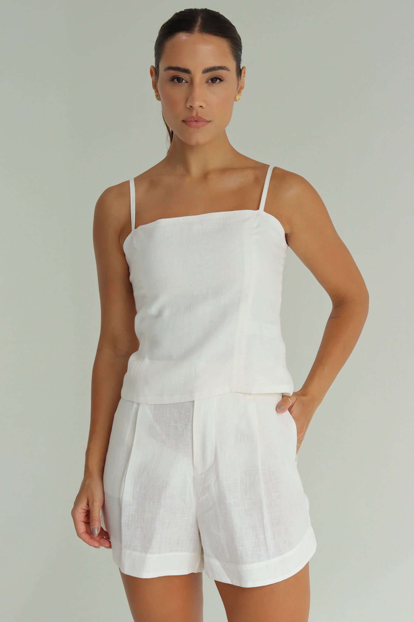Branco short pregas com bolsos P