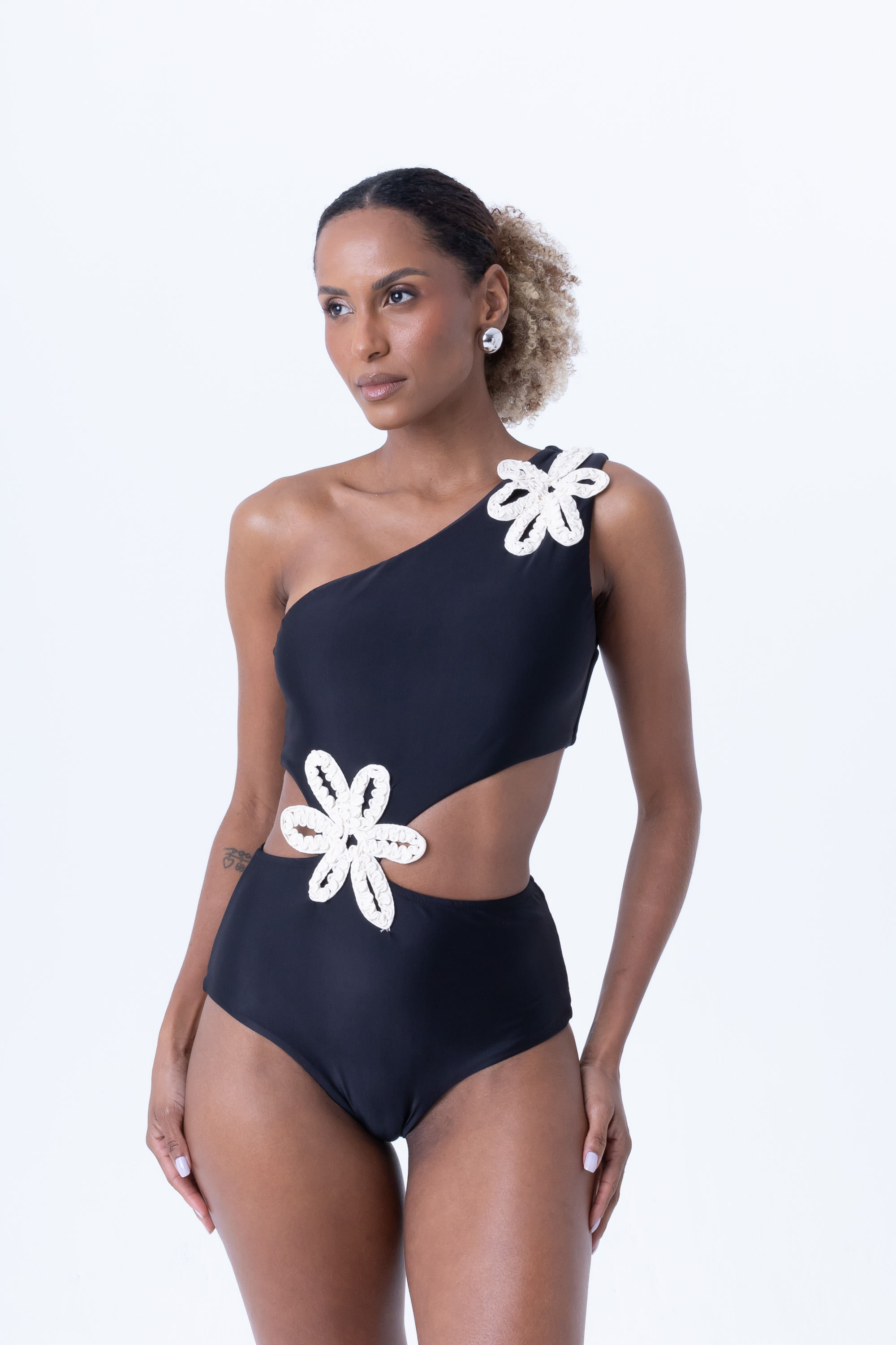 Pérola top de biquíni tomara que caia com aplicação flor P