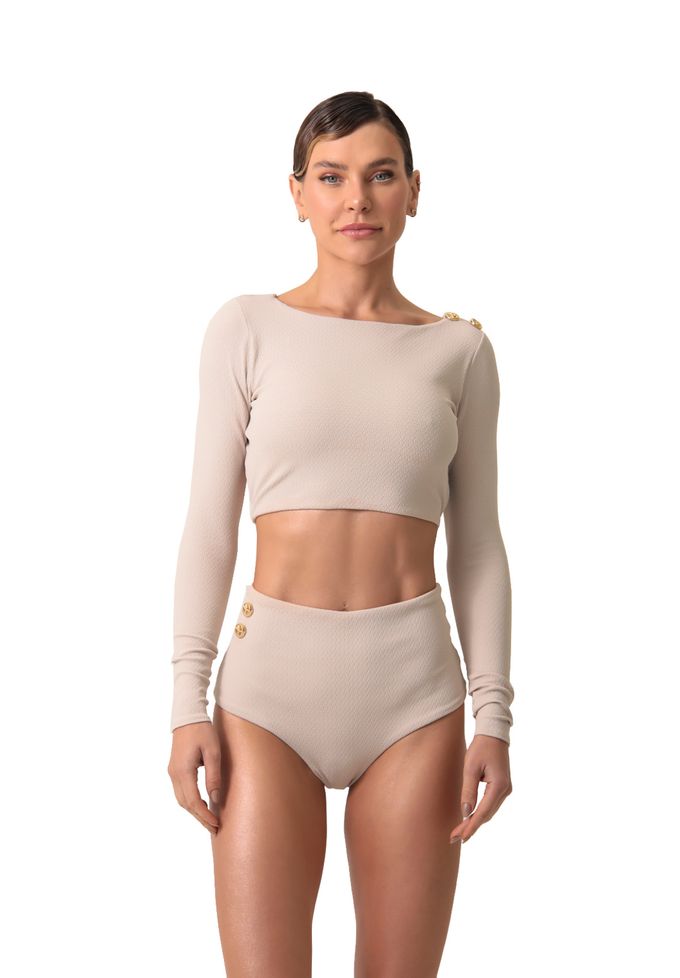 Areia textura top de biquíni cropped frente única com manga longa