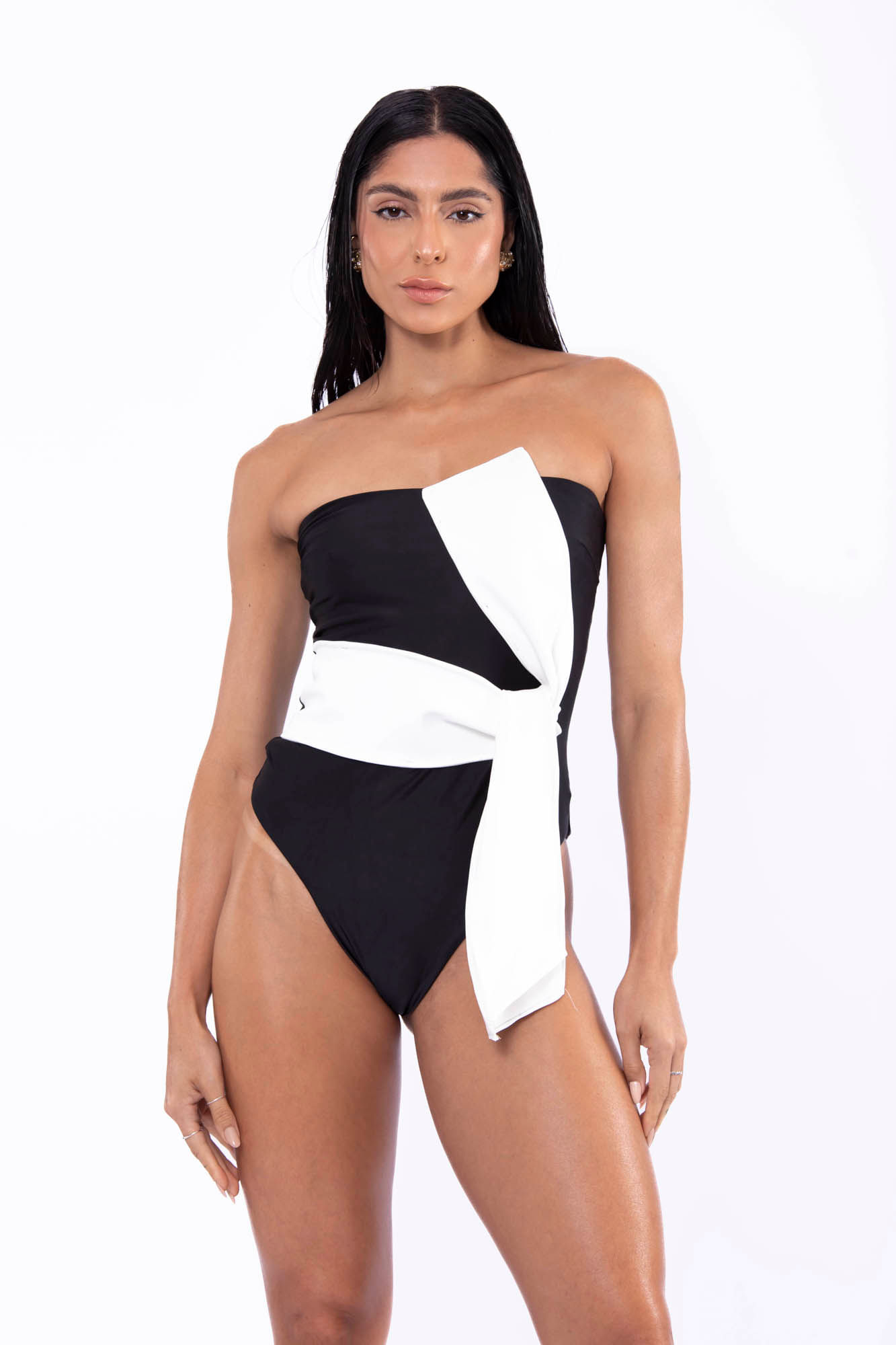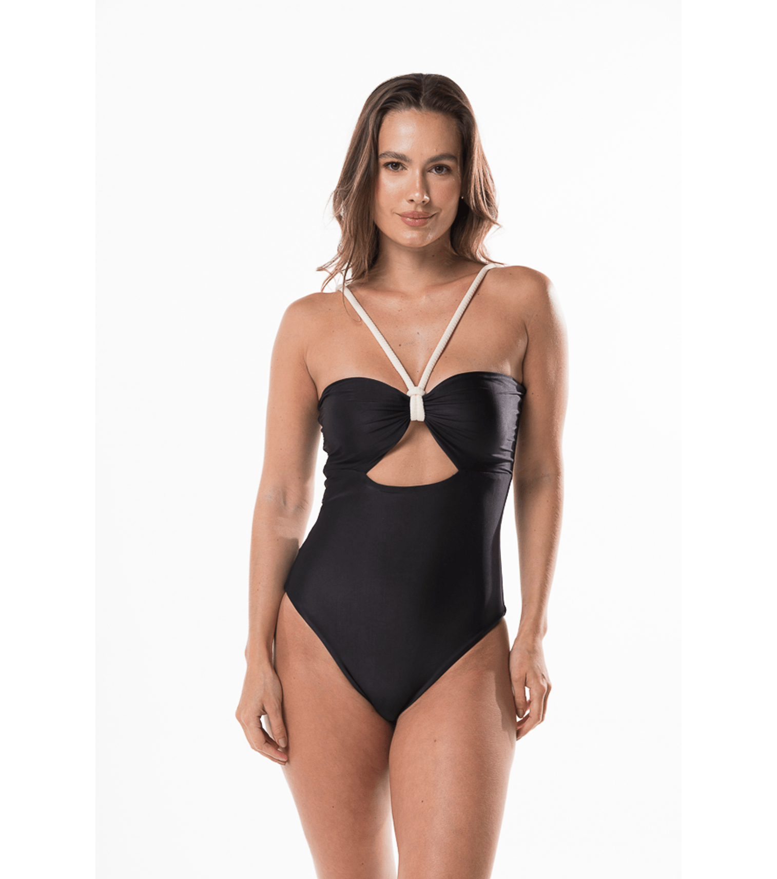 Maiô tomara que caia com cordão cruzado, cor preto, com bojo removivel