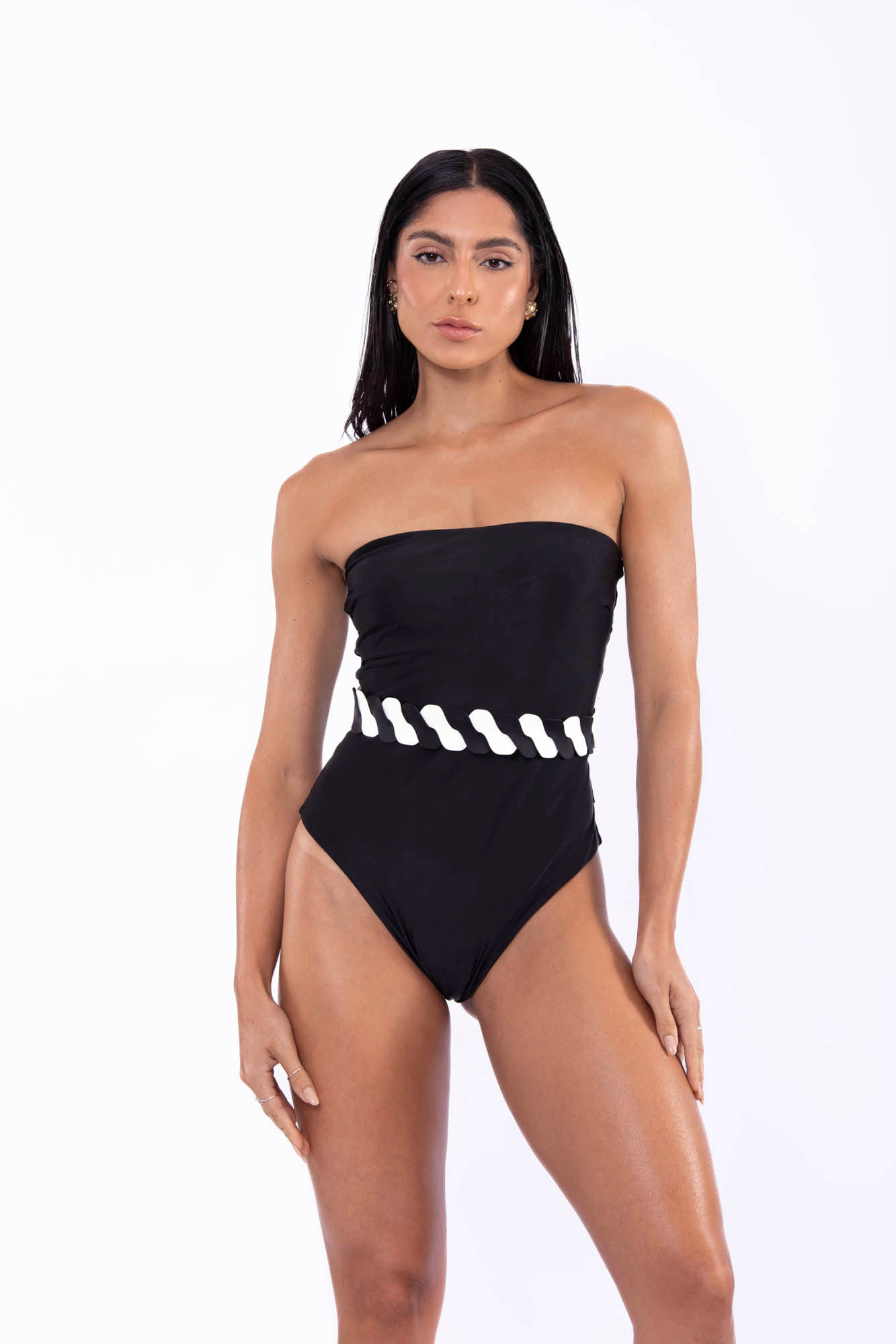 Preto e branco maiô tomara que caia com cinto em trança P
