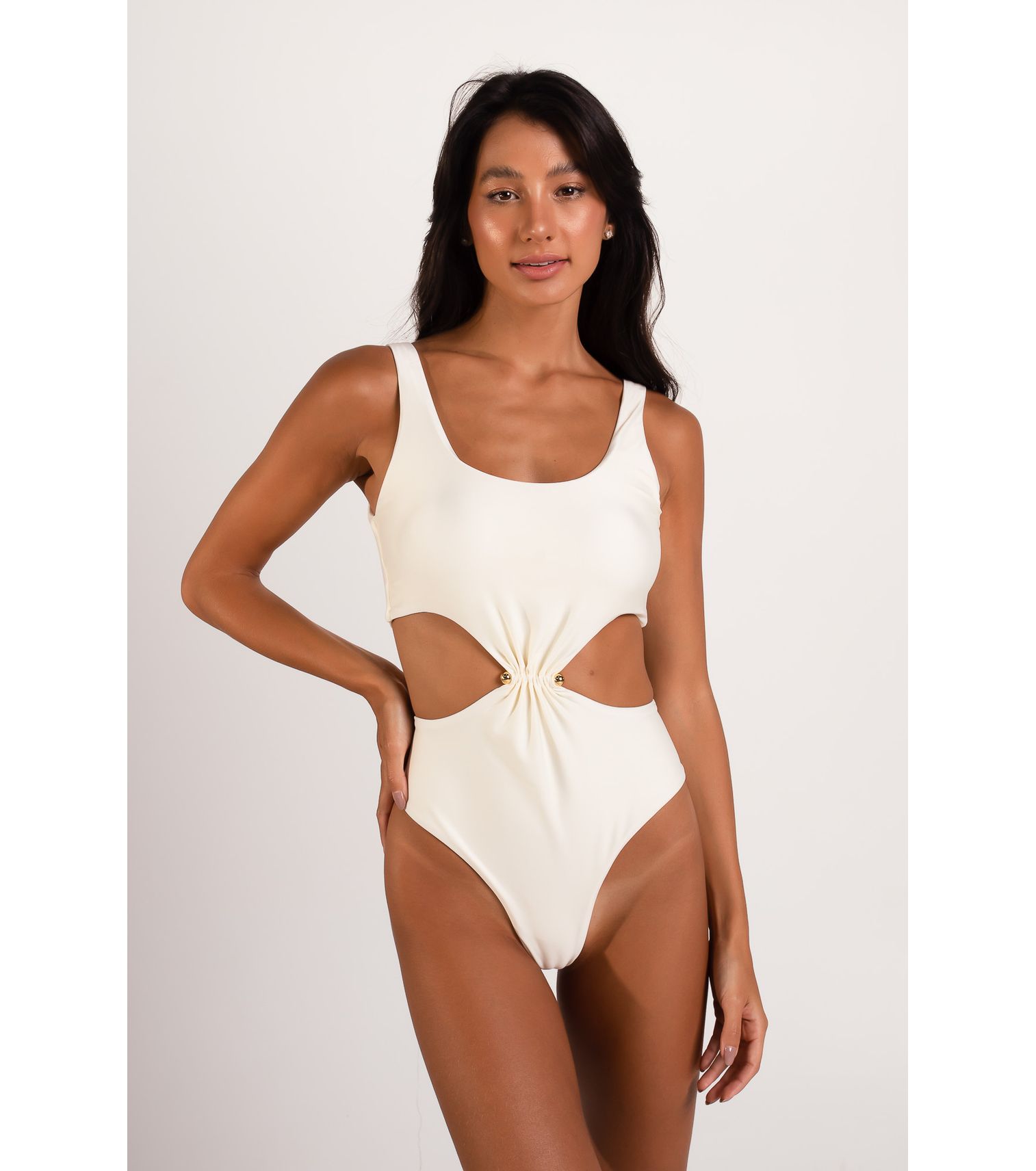 Maiô recorte com piercing e bojo removível, cor pérola.
