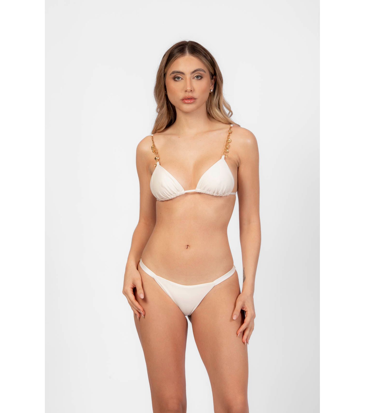 Top de biquíni cortininha corrente com detalhes fundo do mar, cor pérola alças regulaveis, bojo removível e amarração nas costas tecido: microfibra 85% poliamida 15% elastano forro: 88,6% poliamida 11,4 elastano