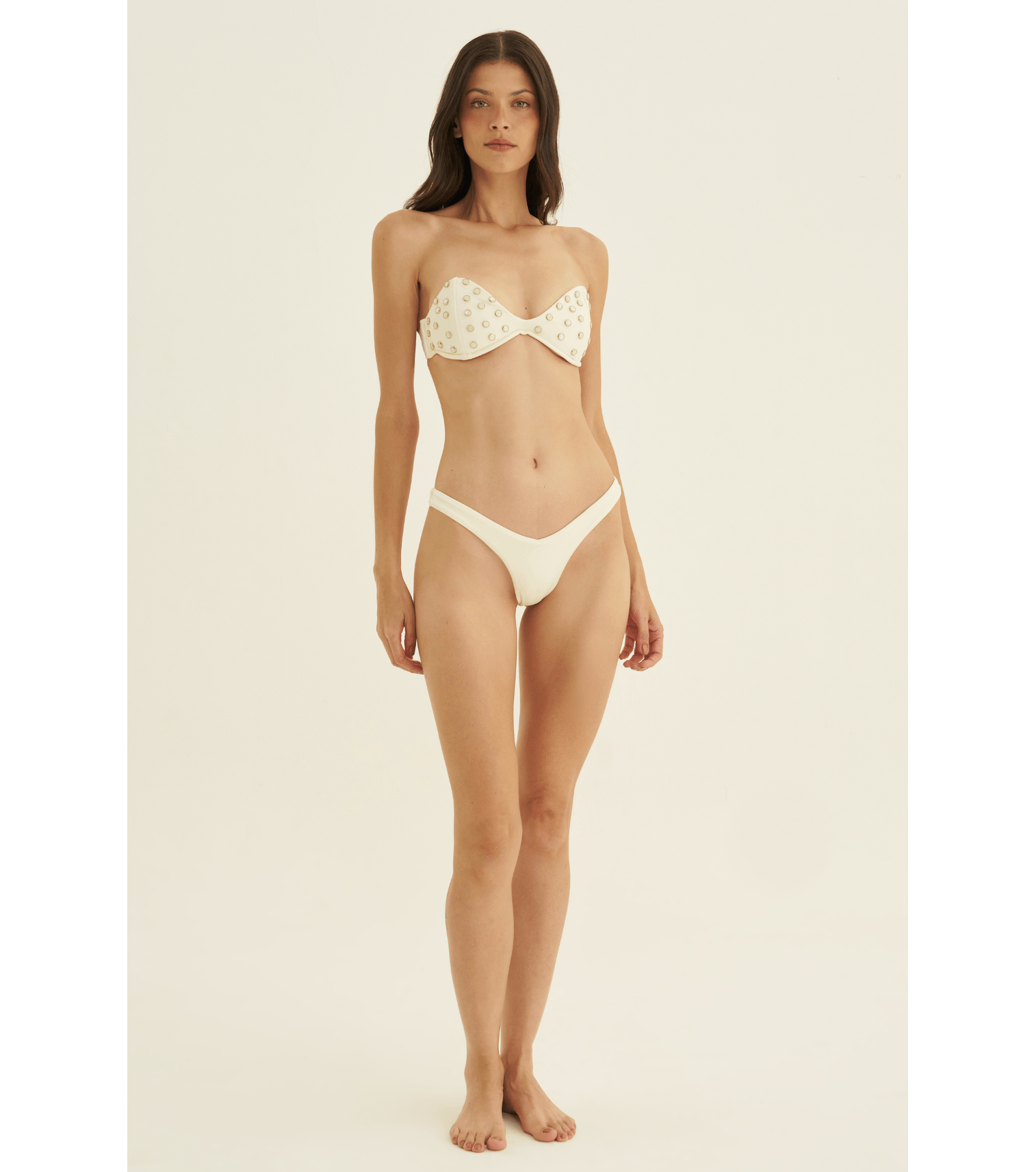 Top de biquíni tomara que caia triângulo com pérolas, cor pérola e abotoador nas costas tecido: microfibra 85% poliamida 15% elastano forro: 88,6% poliamida 11,4 elastano