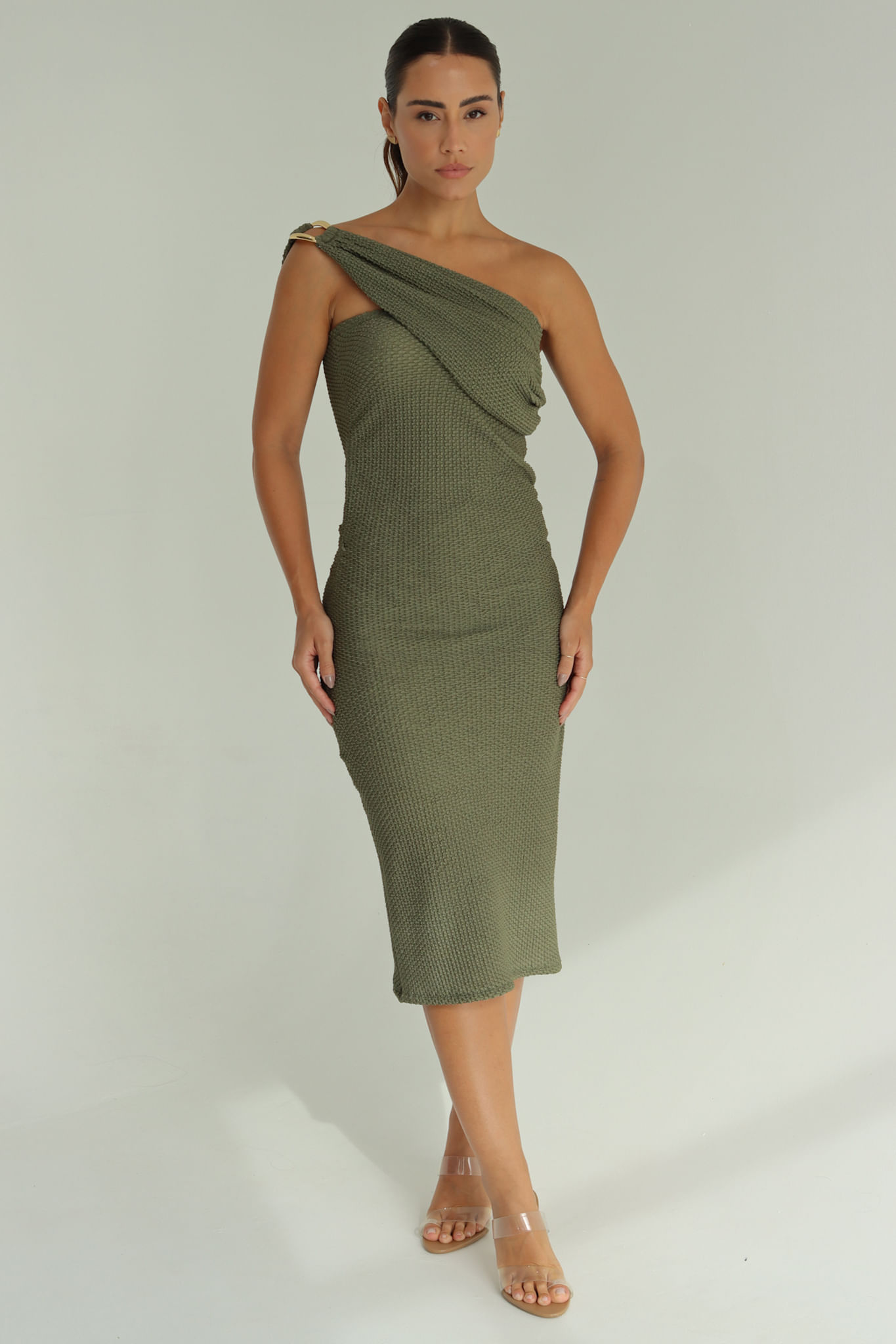 Pistache vestido um ombró só franzido faixa e argola P