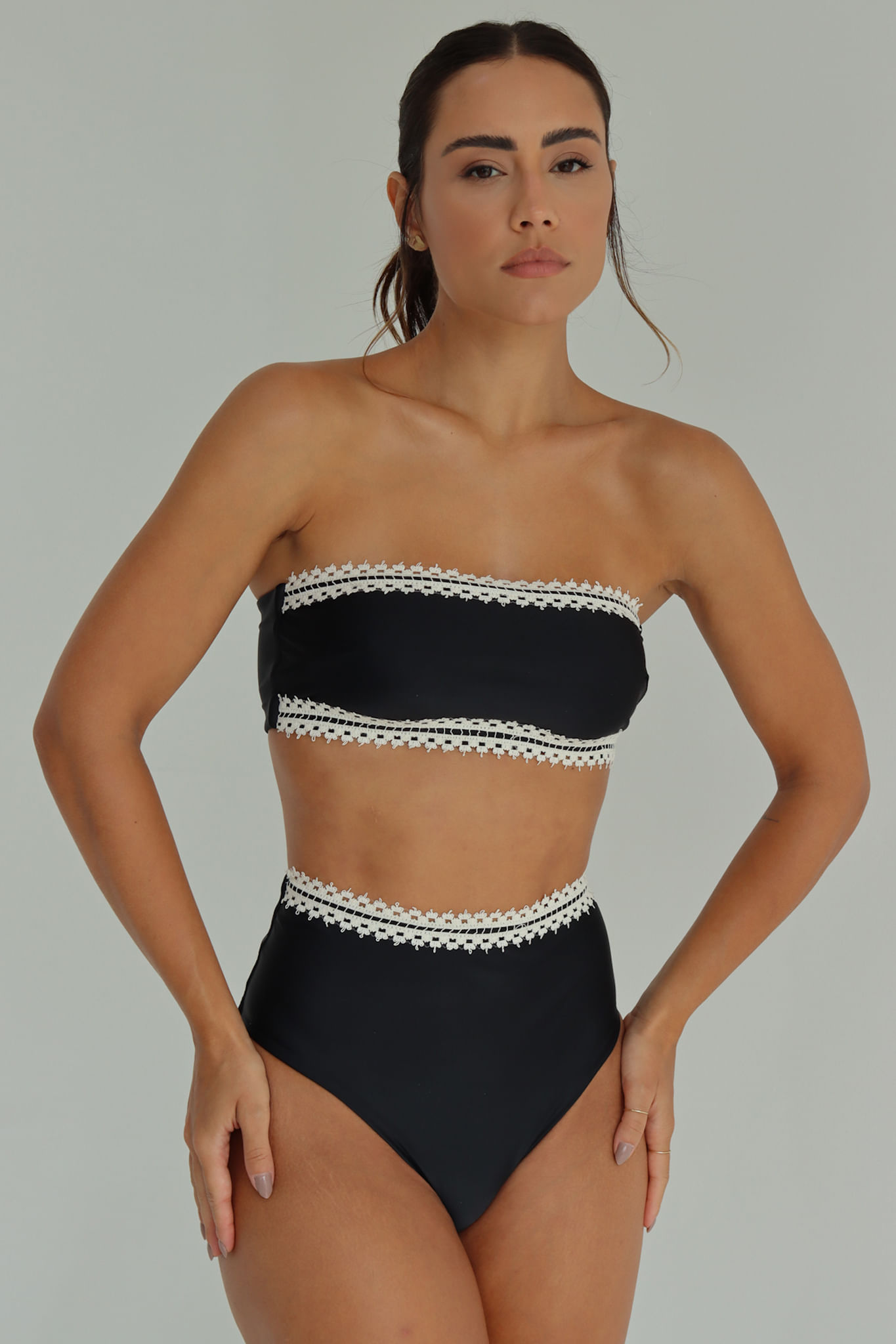 Castanho top de biquíni faixa com recorte e laço off white nas alças P