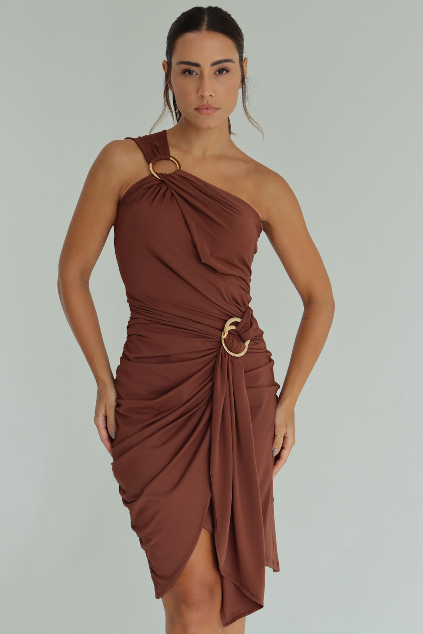 Marrom cacau vestido assimétrico um ombro só com argolas P