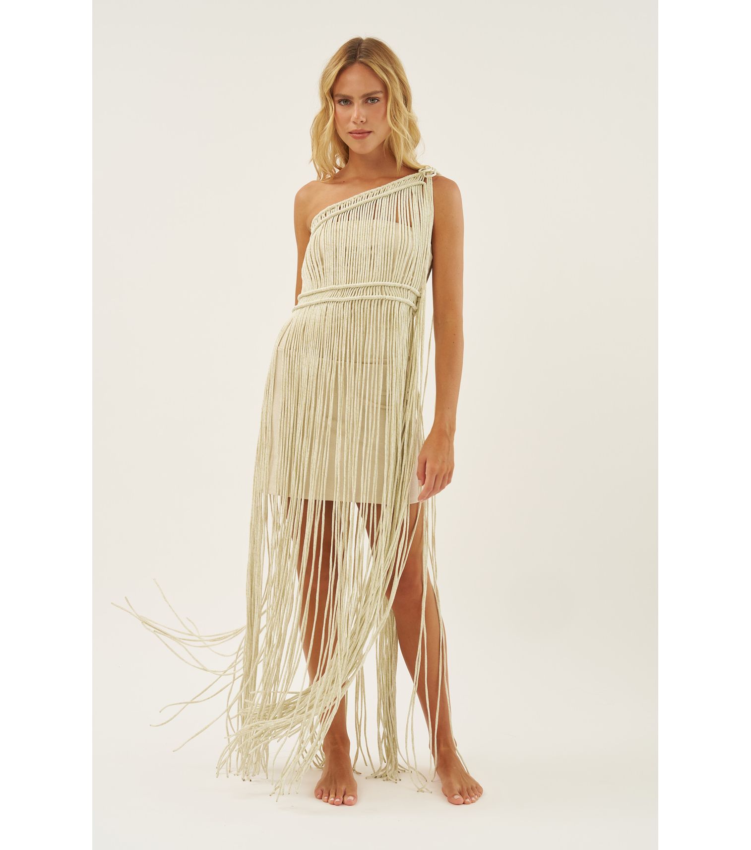 Dourado lurex vestido macramê curto com maiô P