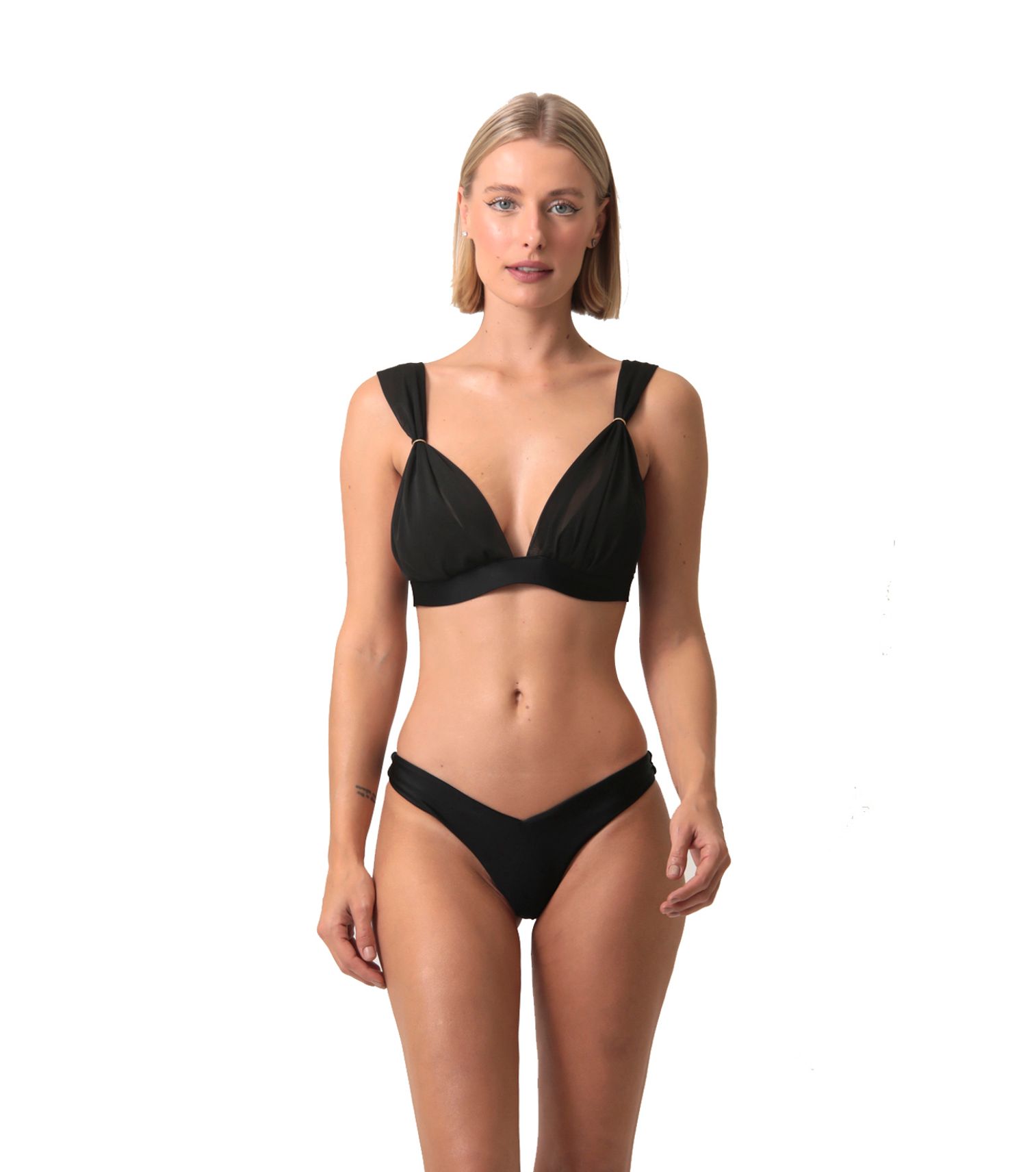Top cortininha com tule sobreposto, cor preto, com bojo removivel e abotoador nas costas;