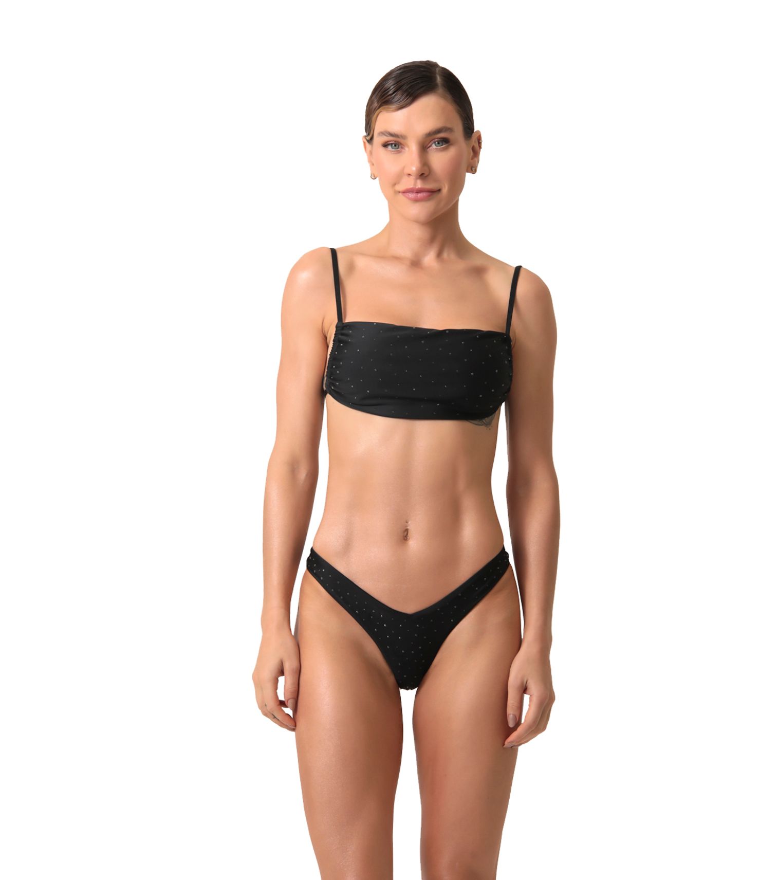 Top faixa com cristais e regulagem laterais, cor preto, com bojo removível;