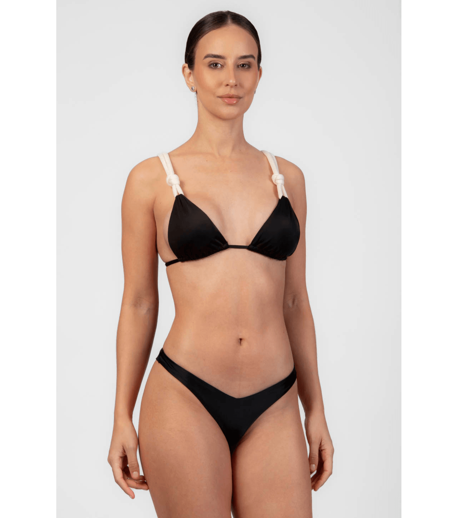 Top de biquini cortinha com alça em cordão off white, com bojo removivel e amarração nas costas na cor preto tecido 85% poliamida 15% elastano forro 88,6% poliamida 11,4% elastano