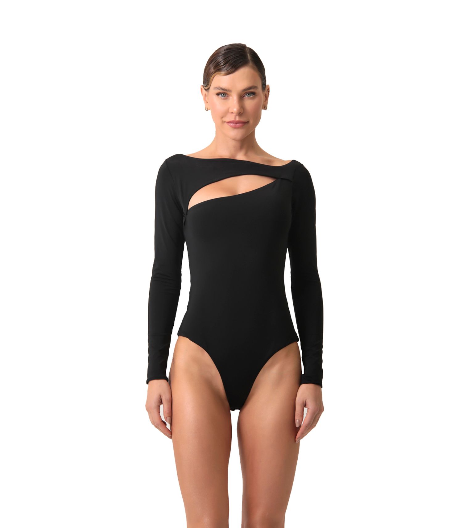Body com recorte frontal e manga longa, cor preto, com abertura embaixo, sem bojo. tecido: fluity plus (82% poliamida; 18% elastano). modelo veste tamanho p. medidas da modelo: busto: 88cm