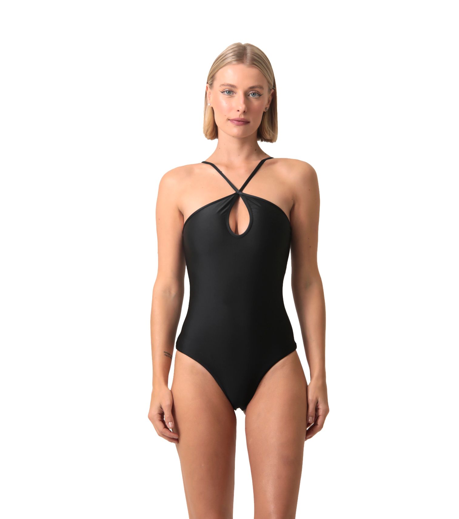 Maiô com decote gota, cor preto, com alças reguláveis e com bojo removível.