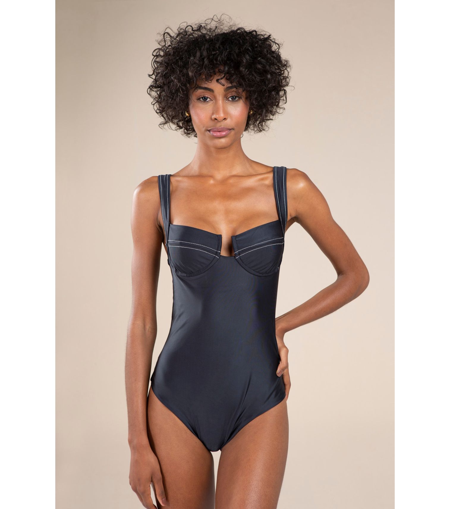 Maiô estruturado com aro e pesponto, cor preto, com bojo removível.