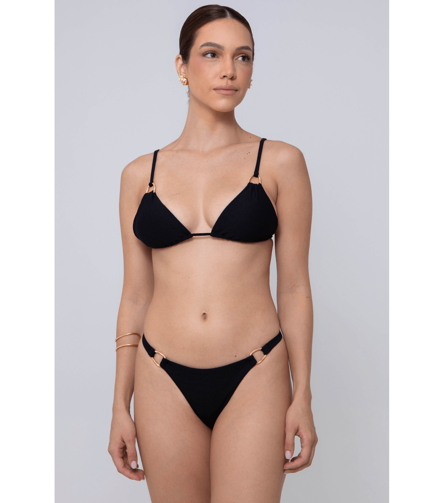 Top de biquini cortininha com metal, bojo removível e alças regulaveis, no preto textura. tecido: 85% poliamida 15% elastano forro: 88,6% poliamida 11,4% elastano.