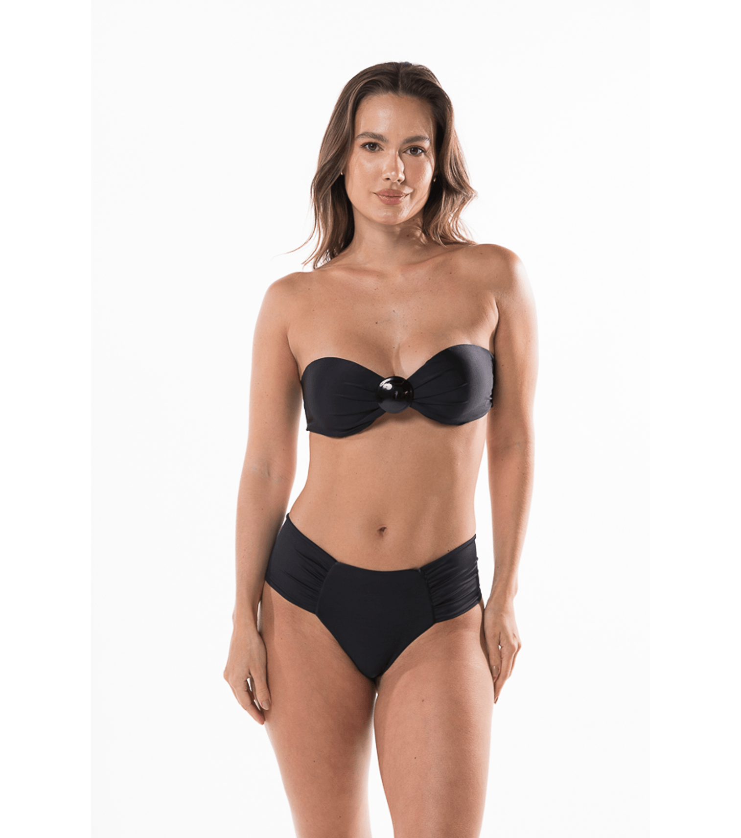 Top de biquíni tomara que caia com metal oval, cor preto, com bojo fixo, alças removiveis e amarração nas costas