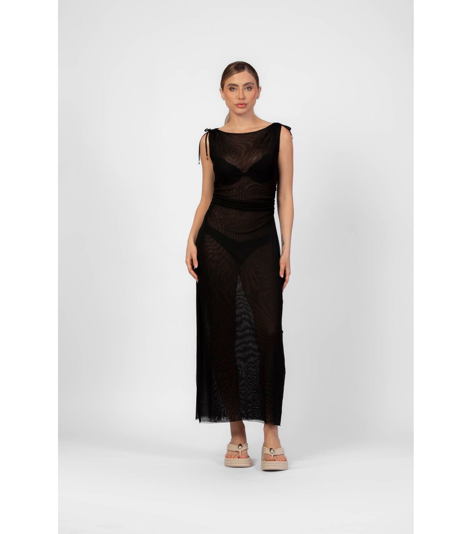 Preto vestido longo franzido com amarração frontal P