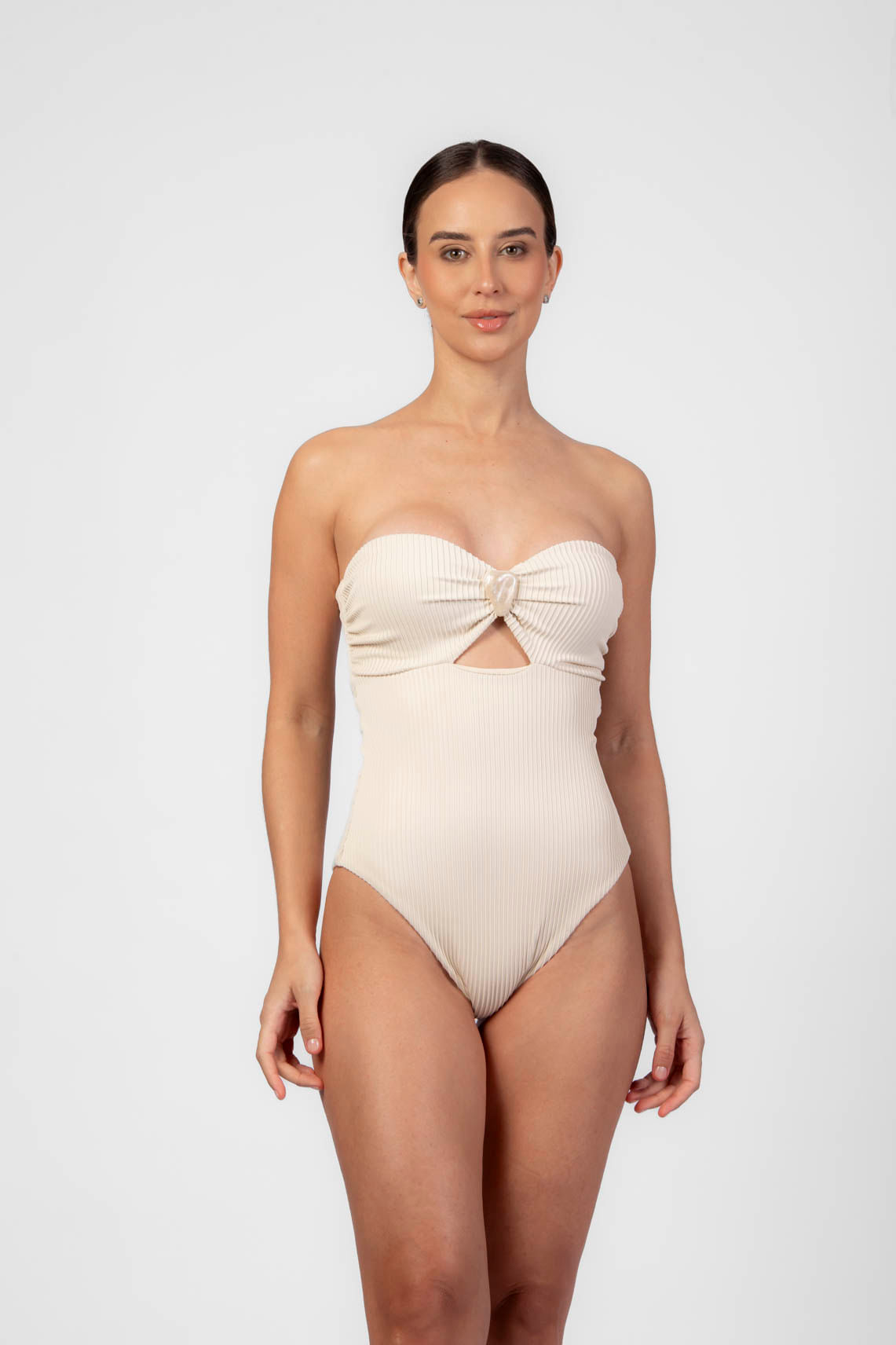 Castanho maiô um ombro só laço off white e recorte cintura P