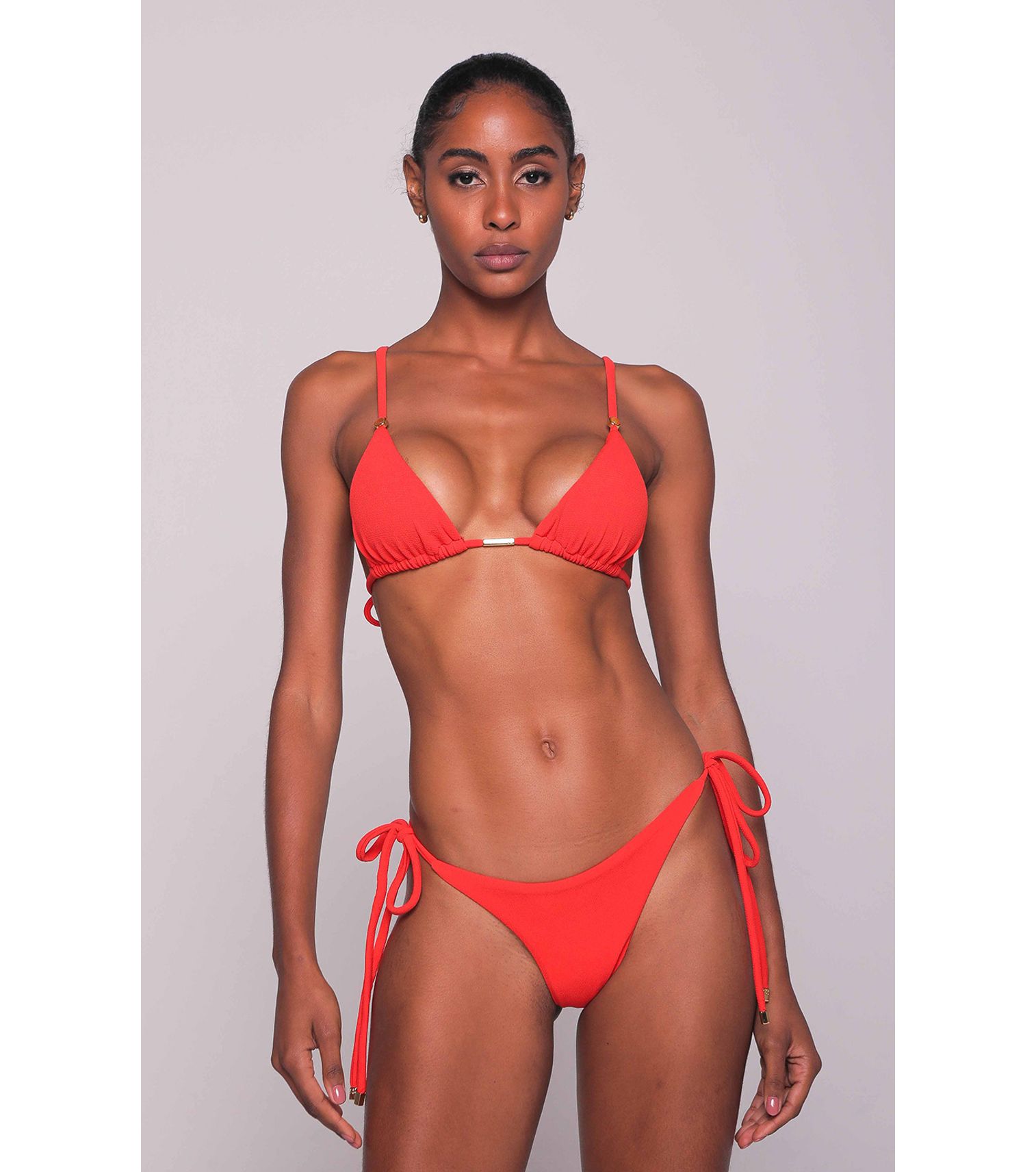 Top de biquíni cortininha duplo, cor tomate textura, com bojo removível e metais.