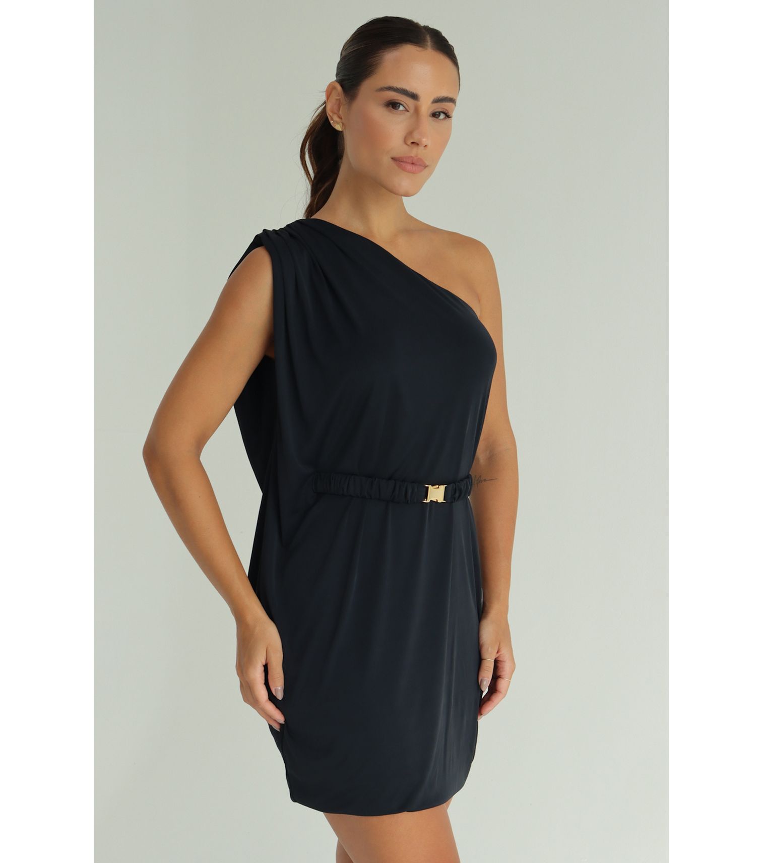 Vestido um ombro só com cinto cor preto tecido: jersey microfibra- 100%poliamida medidas da nossa modelo: tamanho- p cintura- 65cm busto- 87cm quadril- 95cm altura- 1,63cm