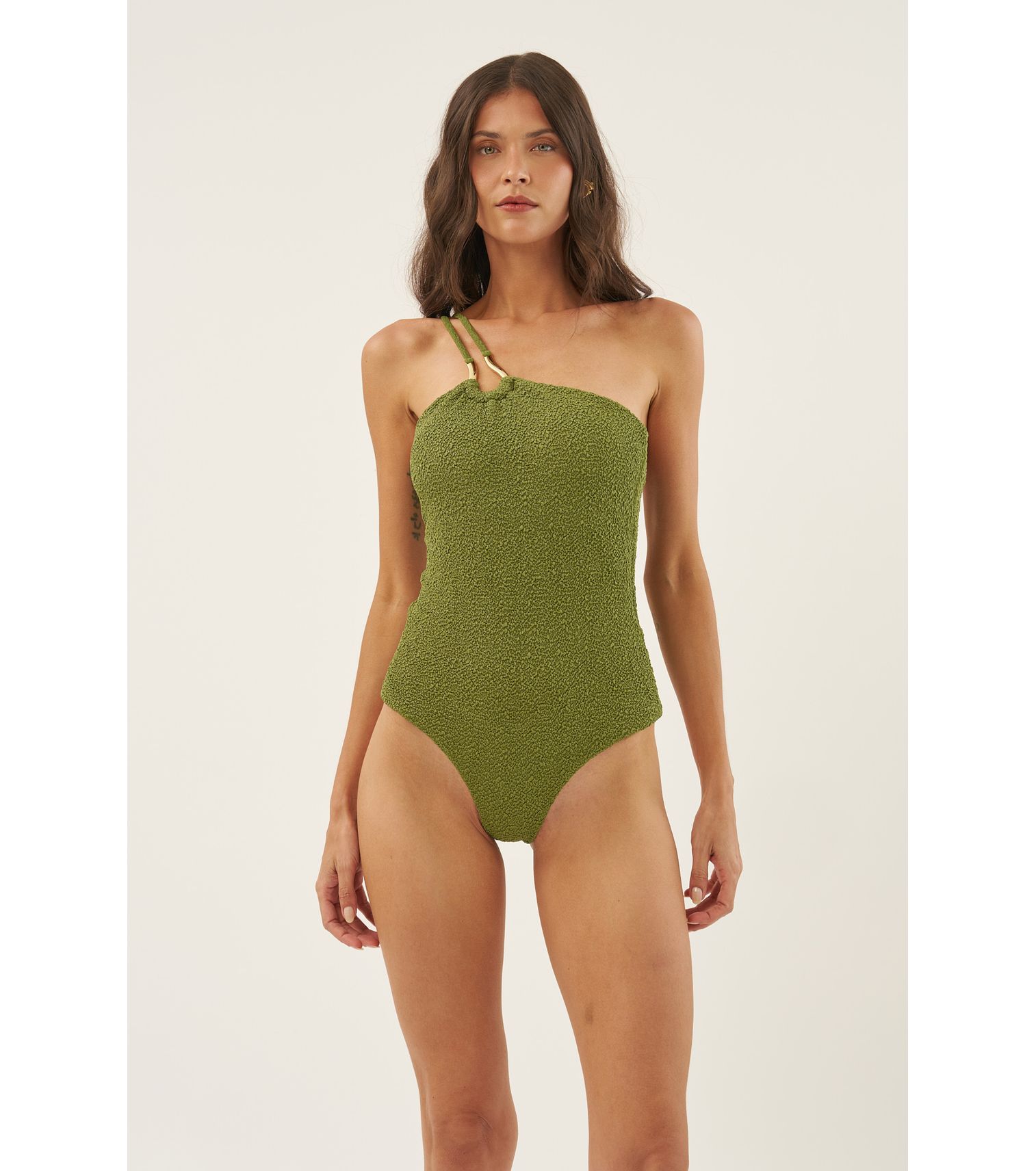 Maiô um ombro só com metal,ferradura e alças regulaveis, na cor verde textura tecido: colmeia 97% poliamida 3% elastano forro: 88,6% poliamida 11,4% elastano